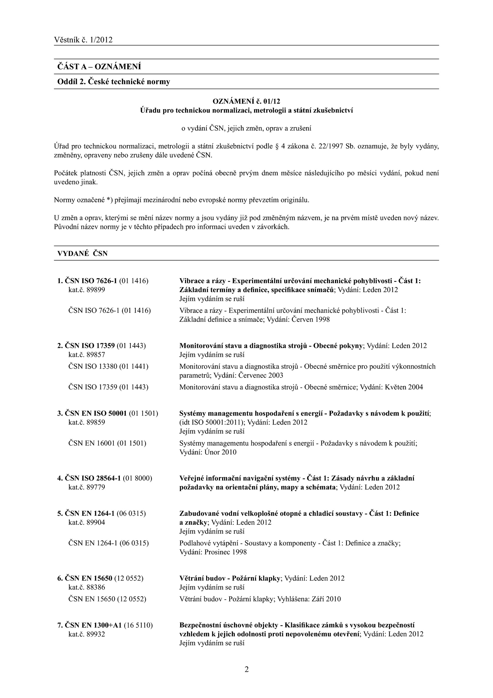 OZNÁMENÍ č. 01/12Úřadu pro technickou normalizaci, metrologii a státní zkušebnictvío vydání ČSN, jejich změn, oprav a zrušeníÚřad pro technickou normalizaci, metrologii a státní zkušebnictví podle § 4 zákona č. 22/1997 Sb. oznamuje, že byly vydány,změněny, opraveny nebo zrušeny dále uvedené ČSN.Počátek platnosti ČSN, jejich změn a oprav počíná obecně prvým dnem měsíce následujícího po měsíci vydání, pokud neníuvedeno jinak.Normy označené *) přejímají mezinárodní nebo evropské normy převzetím originálu.U změn a oprav, kterými se mění název normy a jsou vydány již pod změněným názvem, je na prvém místě uveden nový název.Původní název normy je v těchto případech pro informaci uveden v závorkách.