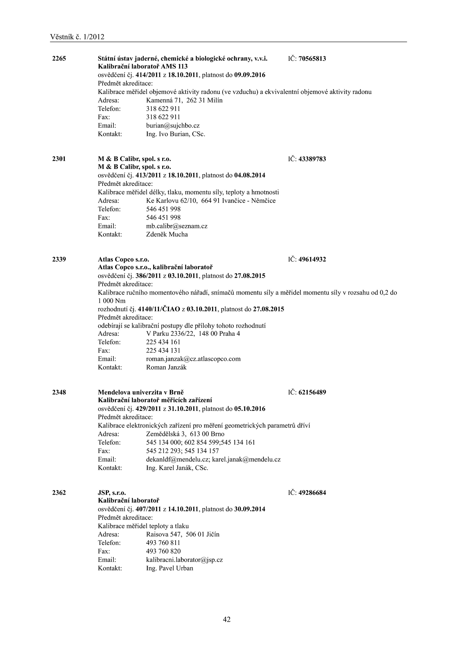 2016 Předmět akreditace: Kalibrace elektronických zařízení pro měření geometrických parametrů dříví Adresa: Zemědělská 613 Brno Telefon: 545 134 000; 602 854 599;545 134 161 Fax: 545 212 293; 545 134 157 Email: dekanldf@mendelu. 2362 JSP, s.10.cz Kontakt: Ing.o.08. 414/2011 z 18.10.2011, platnost 04.2016 Předmět akreditace: Kalibrace měřidel objemové aktivity radonu (ve vzduchu) a ekvivalentní objemové aktivity radonu Adresa: Kamenná 71, 262 Milín Telefon: 318 622 911 Fax: 318 622 911 Email: burian@sujchbo.calibr@seznam.v. IČ: 43389783 M B Calibr, spol. IČ: 70565813 Kalibrační laboratoř AMS 113 osvědčení čj.r. s r. 2301 B Calibr, spol. osvědčení čj. IČ: 49286684 Kalibrační laboratoř osvědčení čj. 386/2011 z 03.2011, platnost 27.2011, platnost 09.r.cz Kontakt: Ing. 4140/11/ČIAO z 03. Pavel Urban .o.2011, platnost 30.10.o.o.cz; karel.2014 Předmět akreditace: Kalibrace měřidel teploty a tlaku Adresa: Raisova 547, 506 Jičín Telefon: 493 760 811 Fax: 493 760 820 Email: kalibracni.janak@mendelu.2015 Předmět akreditace: odebírají kalibrační postupy dle přílohy tohoto rozhodnutí Adresa: Parku 2336/22, 148 Praha 4 Telefon: 225 434 161 Fax: 225 434 131 Email: roman.cz Kontakt: Zdeněk Mucha 2339 Atlas Copco s.laborator@jsp.2014 Předmět akreditace: Kalibrace měřidel délky, tlaku, momentu síly, teploty a hmotnosti Adresa: Karlovu 62/10, 664 Ivančice Němčice Telefon: 546 451 998 Fax: 546 451 998 Email: mb. IČ: 49614932 Atlas Copco s.r.2011, platnost 05.i. Karel Janák, CSc. 429/2011 z 31.com Kontakt: Roman Janzák 2348 Mendelova univerzita v Brně IČ: 62156489 Kalibrační laboratoř měřicích zařízení osvědčení čj.Věstník 1/2012 42 2265 Státní ústav jaderné, chemické a biologické ochrany, v.o.janzak@cz.10.10. 413/2011 z 18. s r.09.2015 Předmět akreditace: Kalibrace ručního momentového nářadí, snímačů momentu síly a měřidel momentu síly v rozsahu 0,2 do 1 000 Nm rozhodnutí čj.2011, platnost 27.cz Kontakt: Ing.08.10. Ivo Burian, CSc.atlascopco.09. 407/2011 z 14., kalibrační laboratoř osvědčení čj.08.10