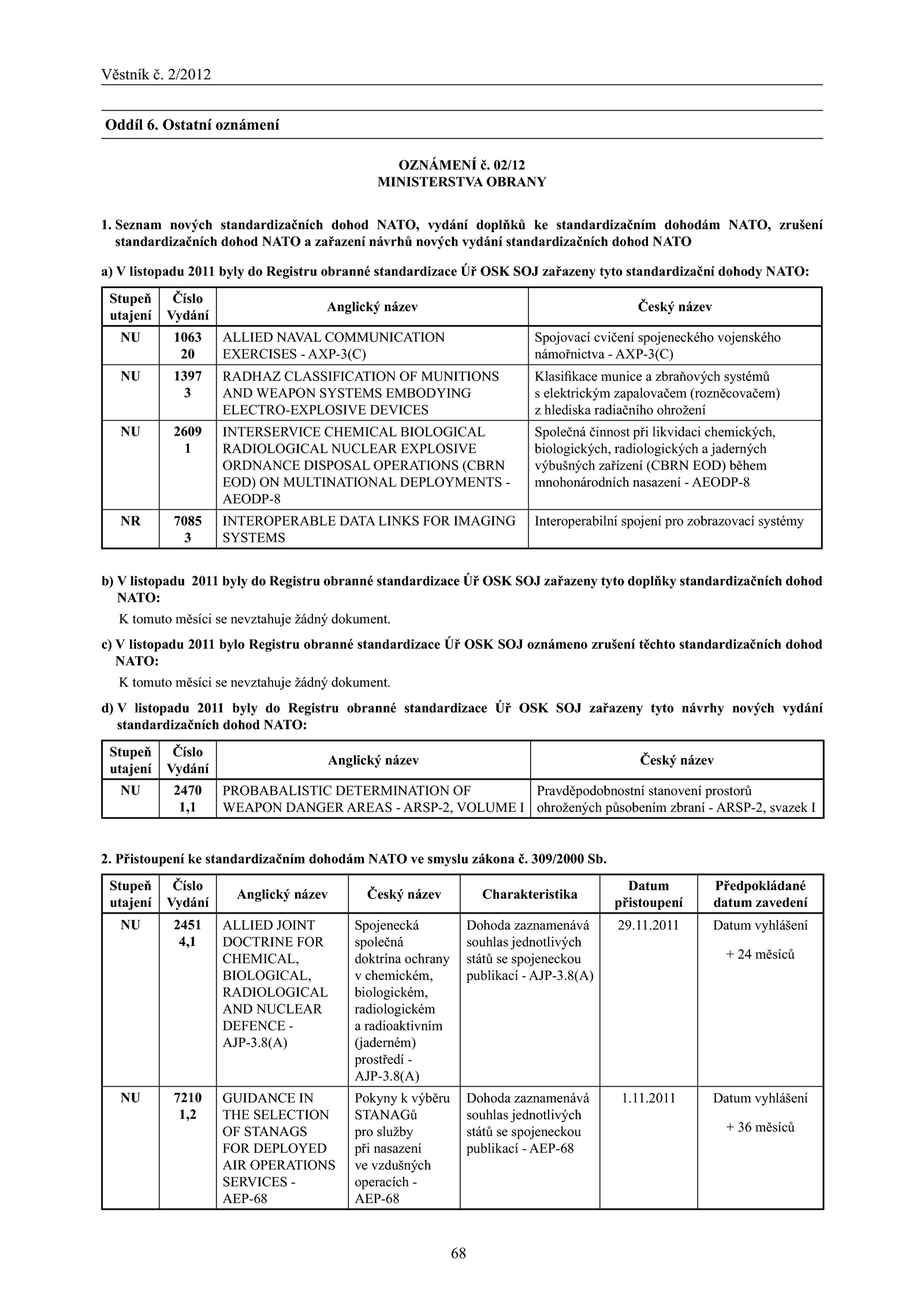 1. Seznam nových standardizačních dohod NATO, vydání doplňků standardizačním dohodám NATO, zrušení