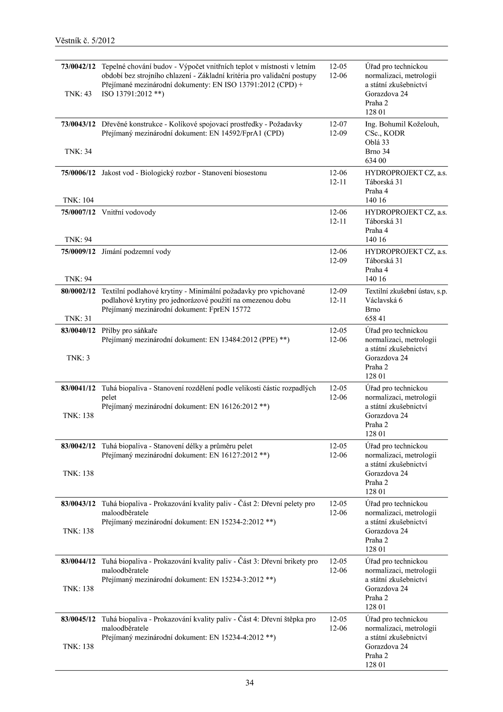 OZNÁMENÍ č. 42/12Úřadu pro technickou normalizaci, metrologii a státní zkušebnictvío určených normáchÚřad pro technickou normalizaci, metrologii a státní zkušebnictví oznamuje podle § 4a odst. 2 zákona č. 22/1997 Sb., o technických požadavcích na výrobky a o změně a doplnění některých zákonů,ve znění pozdějších předpisů, určené normy vztahující se k jednotlivým nařízením vlády ...