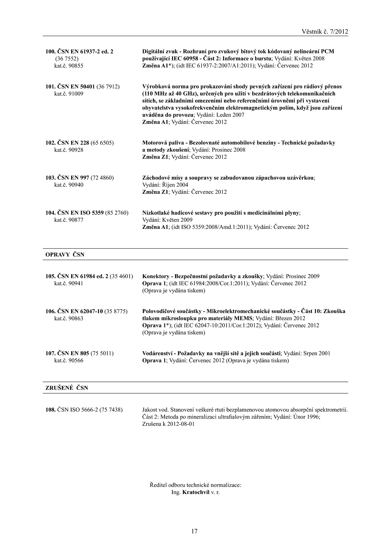 OZNÁMENÍ č. 78/12Úřadu pro technickou normalizaci, metrologii a státní zkušebnictvío určených normáchÚřad pro technickou normalizaci, metrologii a státní zkušebnictví oznamuje podle § 4a odst. 2 zákona č. 22/1997 Sb., o technických požadavcích na výrobky a o změně a doplnění některých zákonů,ve znění pozdějších předpisů, určené normy vztahující se k jednotlivým nařízením vládyPoznámkaTímto oznámením se doplňují oznámení o určených normách, zveřejněná ve Věstníku ÚNMZ č. 9/97, ...