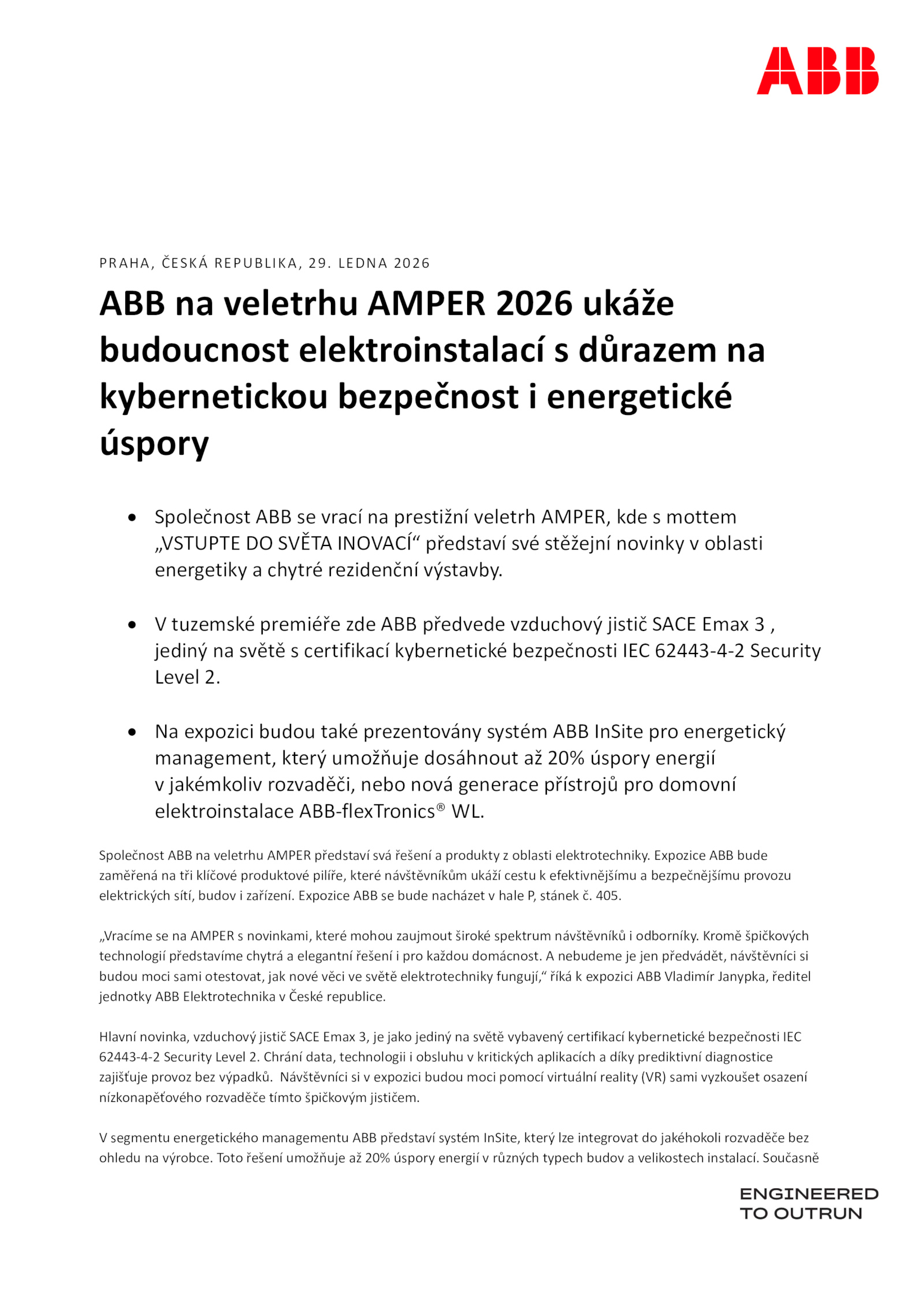Společnost ABB veletrhu AMPER představí svá řešení produkty oblasti elektrotechniky. Současně