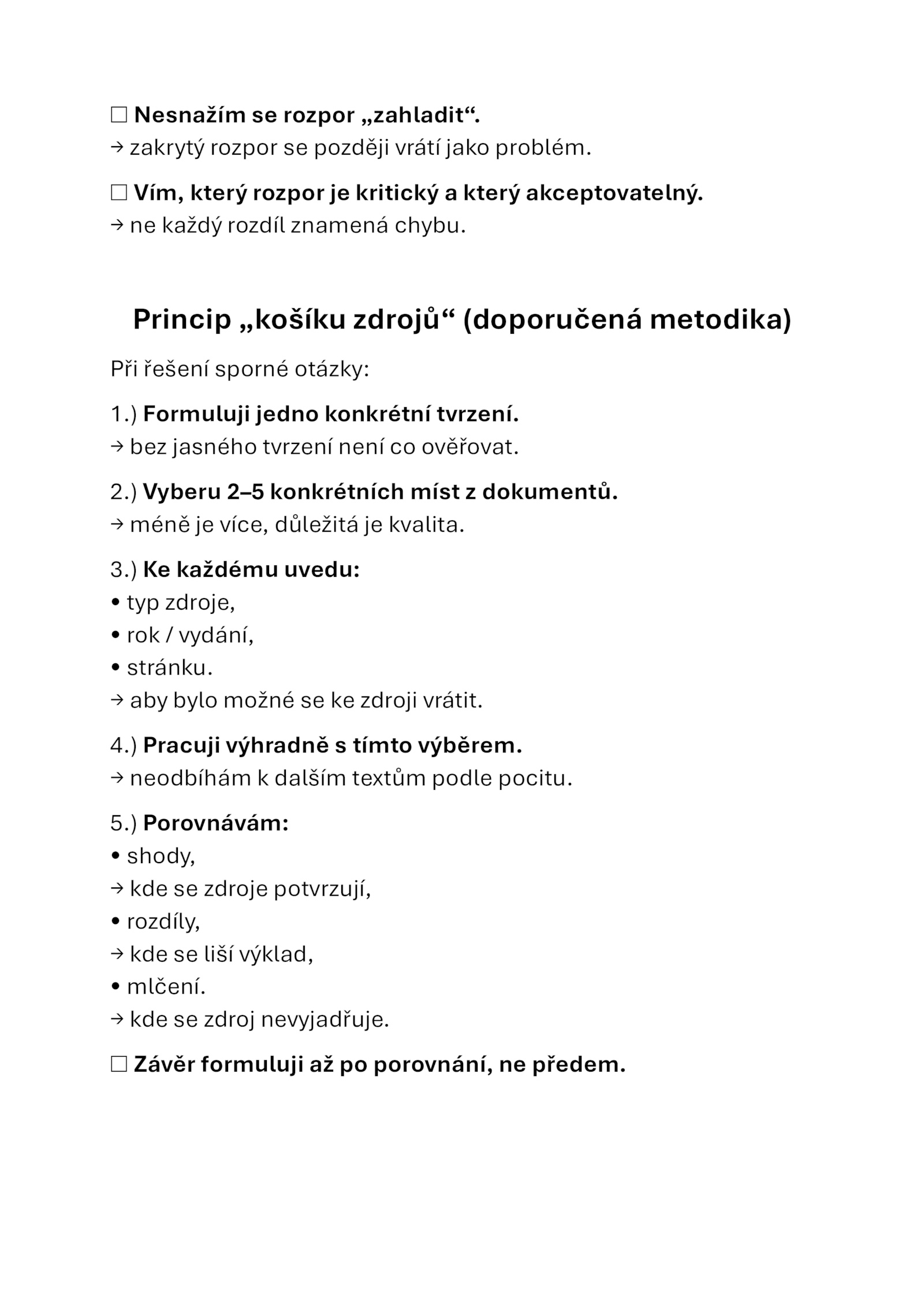 → zakrytý rozpor později vrátí jako problém.) Vyberu 2–5 konkrétních míst dokumentů.Nesnažím rozpor „zahladit“.