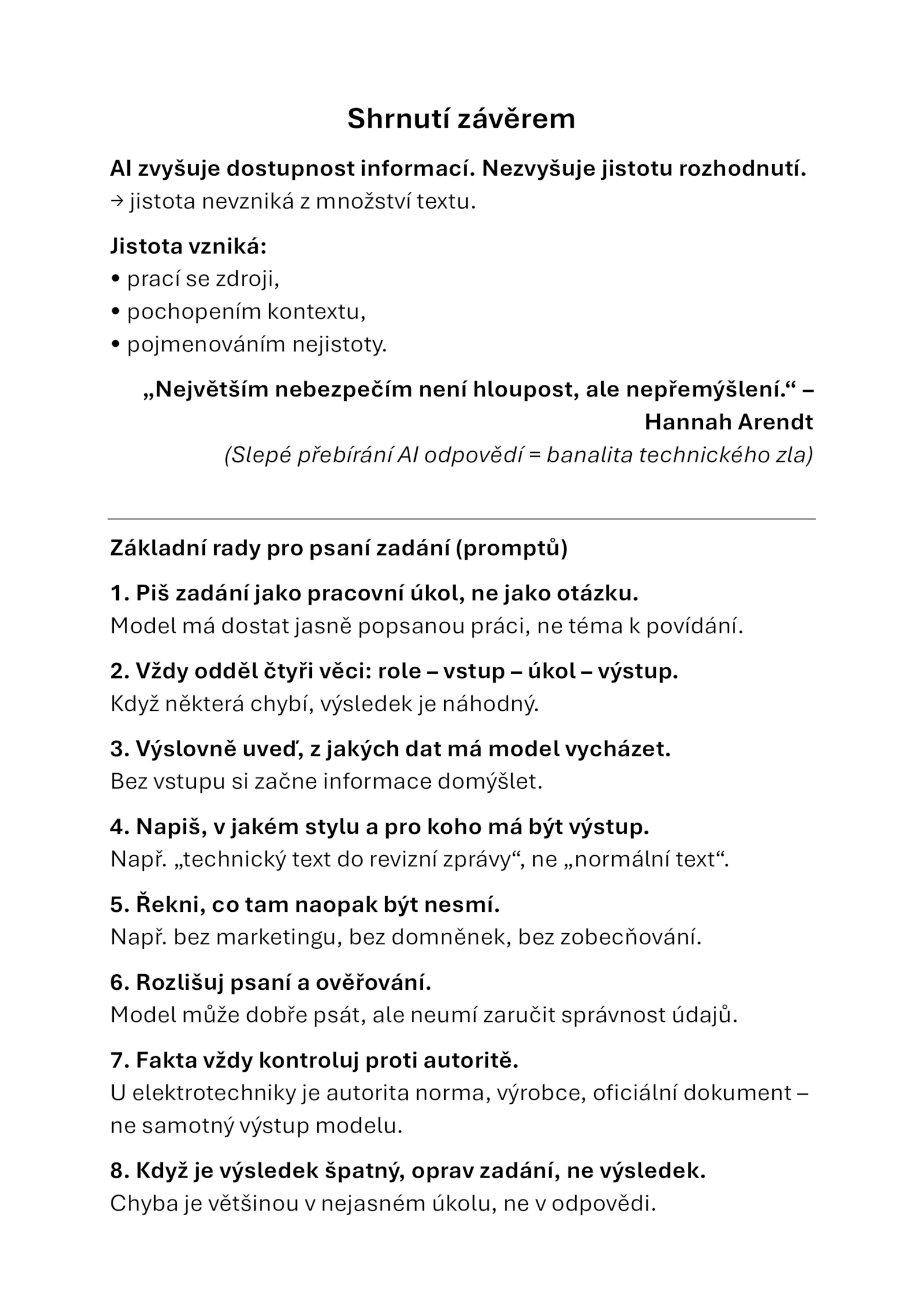 Bez vstupu začne informace domýšlet. „technický text revizní zprávy“, „normální text“. Fakta vždy kontroluj proti autoritě. Piš zadání jako pracovní úkol, jako otázku.