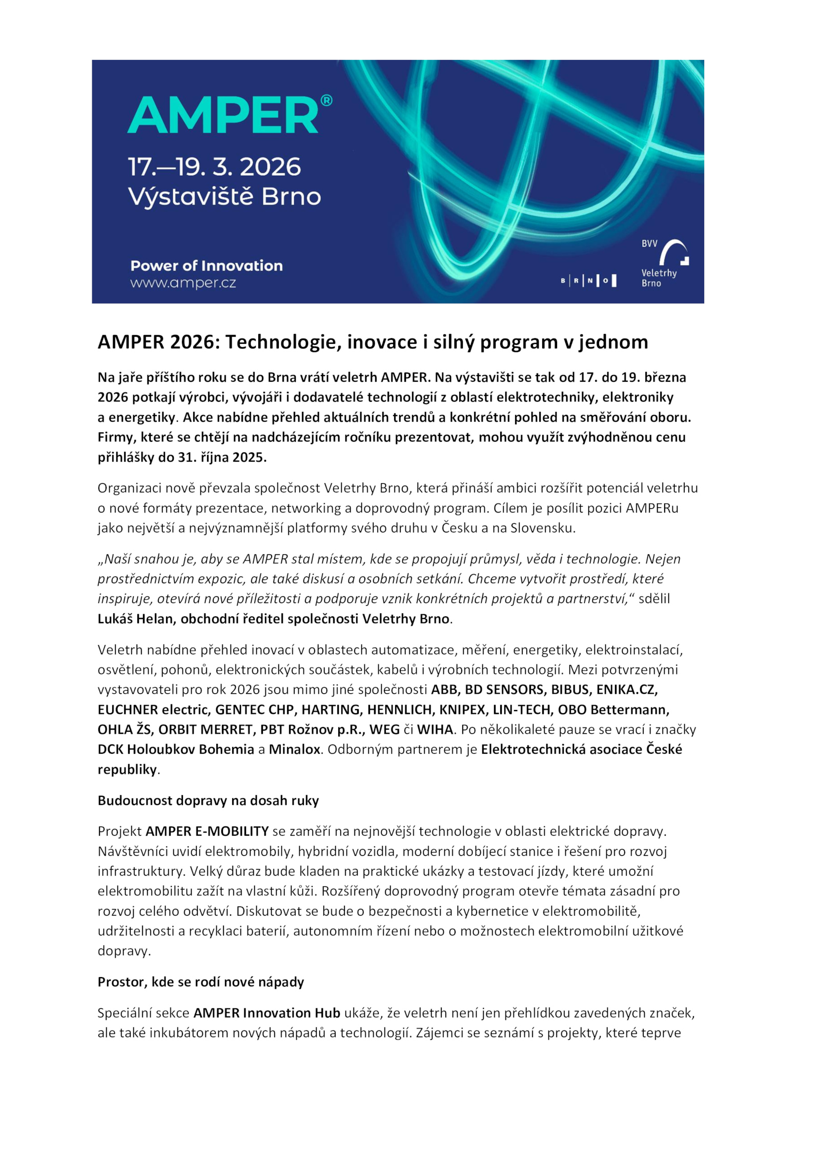 republiky.AMPER 2026: Technologie, inovace silný program jednom