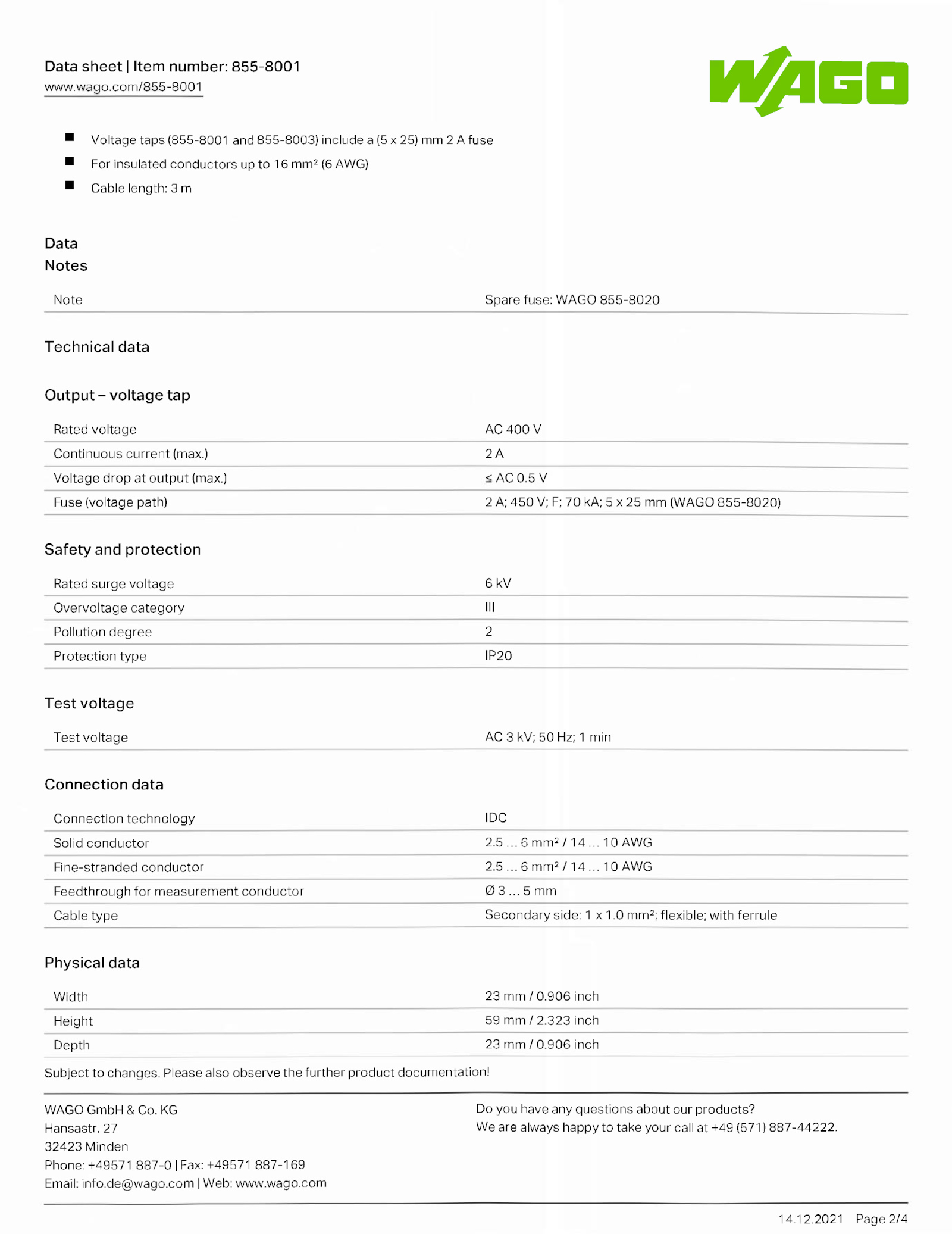 Note Spare fuse: WAGO 855-8020