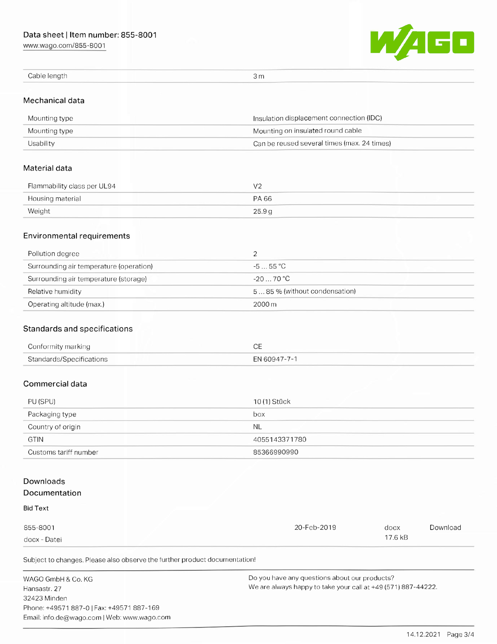 Data sheet Item number: 855-8001