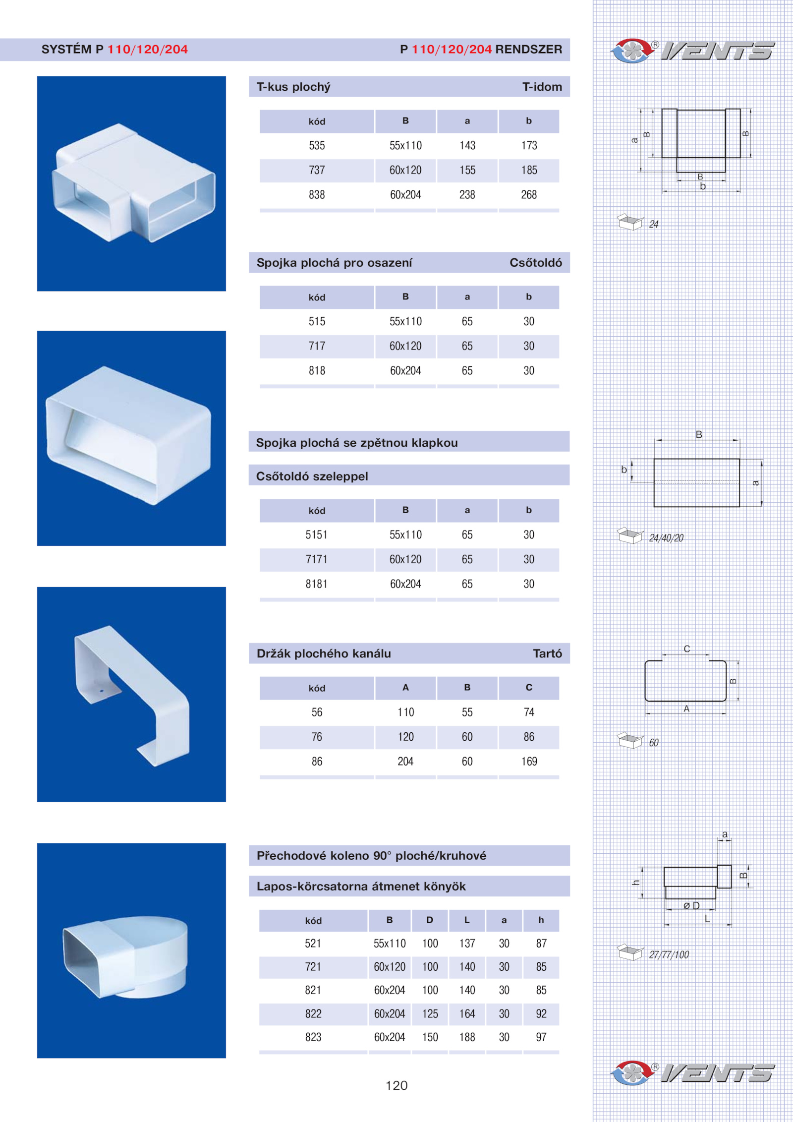 SYSTÉM 110/120/204 110/120/204 RENDSZER 120 T-kus plochý T-idom kód b 535 55x110 143 173 737 60x120 155 185 838 60x204 238 268 Spojka plochá pro osazení Csőtoldó Přechodové koleno 90° ploché/kruhové Lapos-körcsatorna átmenet könyök kód b 515 55x110 30 717 60x120 30 818 60x204 30 kód b 5151 55x110 30 7171 60x120 30 8181 60x204 30 Držák plochého kanálu Tartó kód C 56 110 74 76 120 86 86 204 169 Spojka plochá zpětnou klapkou Csőtoldó szeleppel kód h 521 55x110 100 137 87 721 60x120 100 140 85 821 60x204 100 140 85 822 60x204 125 164 92 823 60x204 150 188 97 24 24/40/20 60 27/77/100
