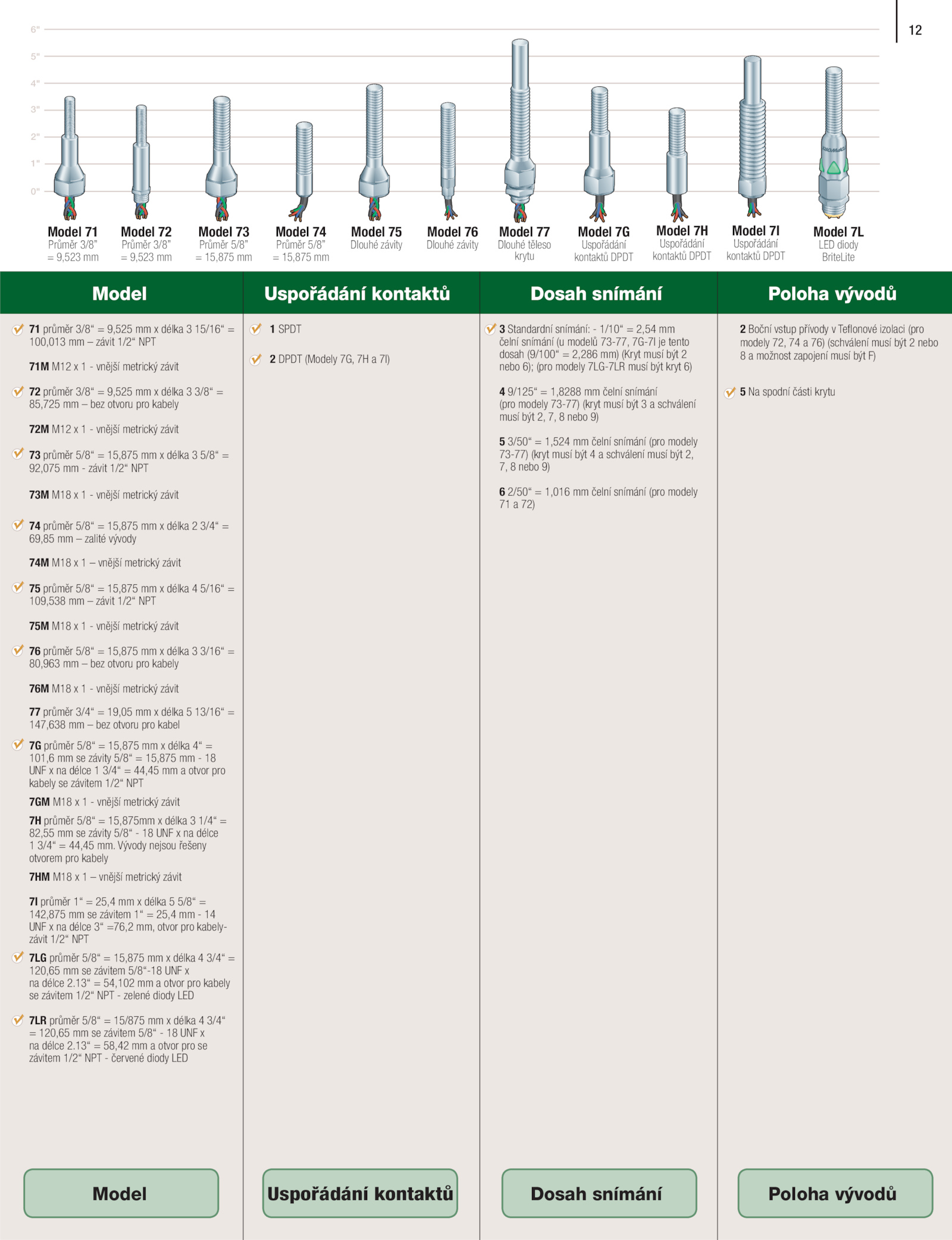 Model Uspořádání kontaktů Dosah snímání Poloha vývodů
