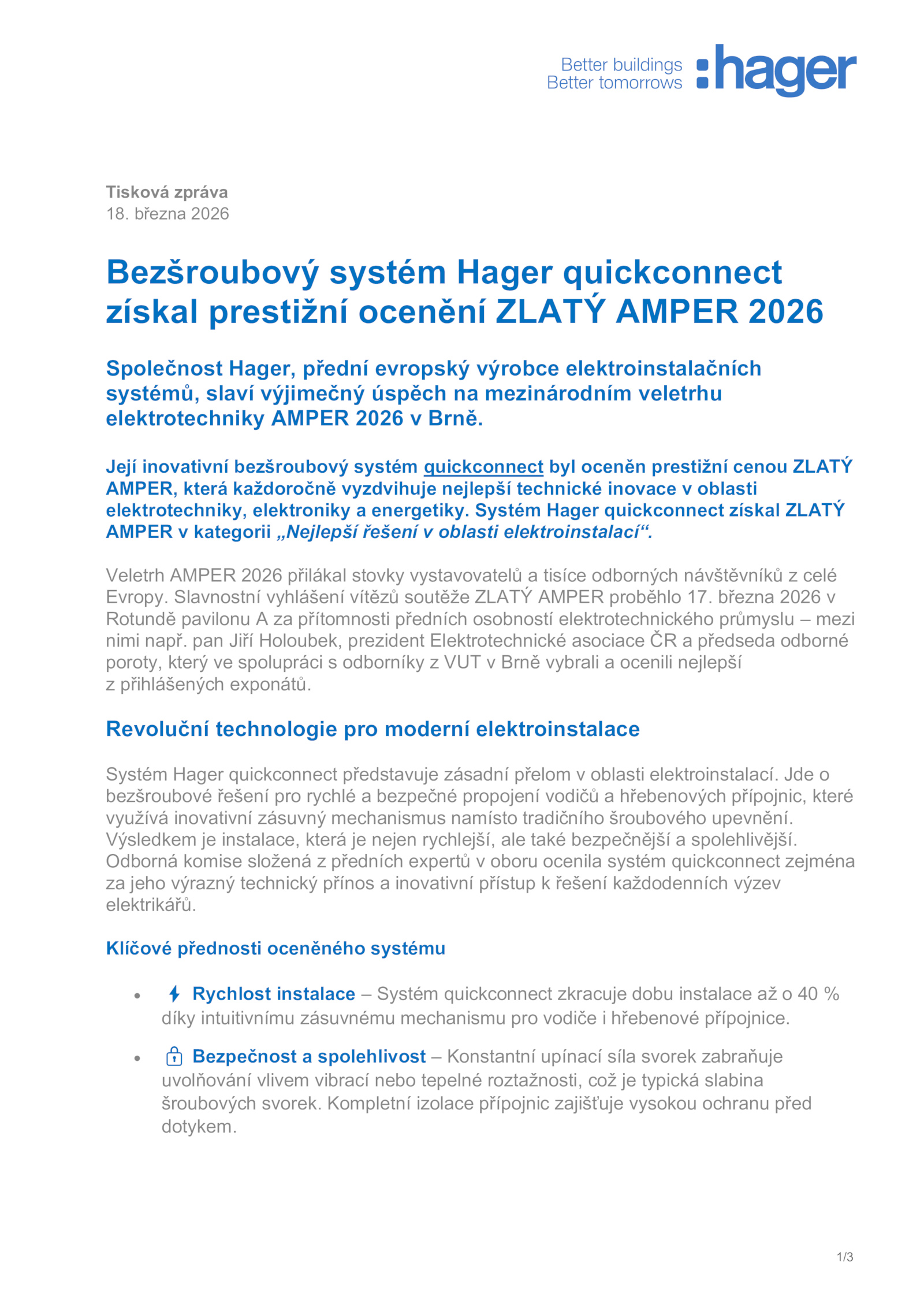 elektrikářů. Systém Hager quickconnect získal ZLATÝ