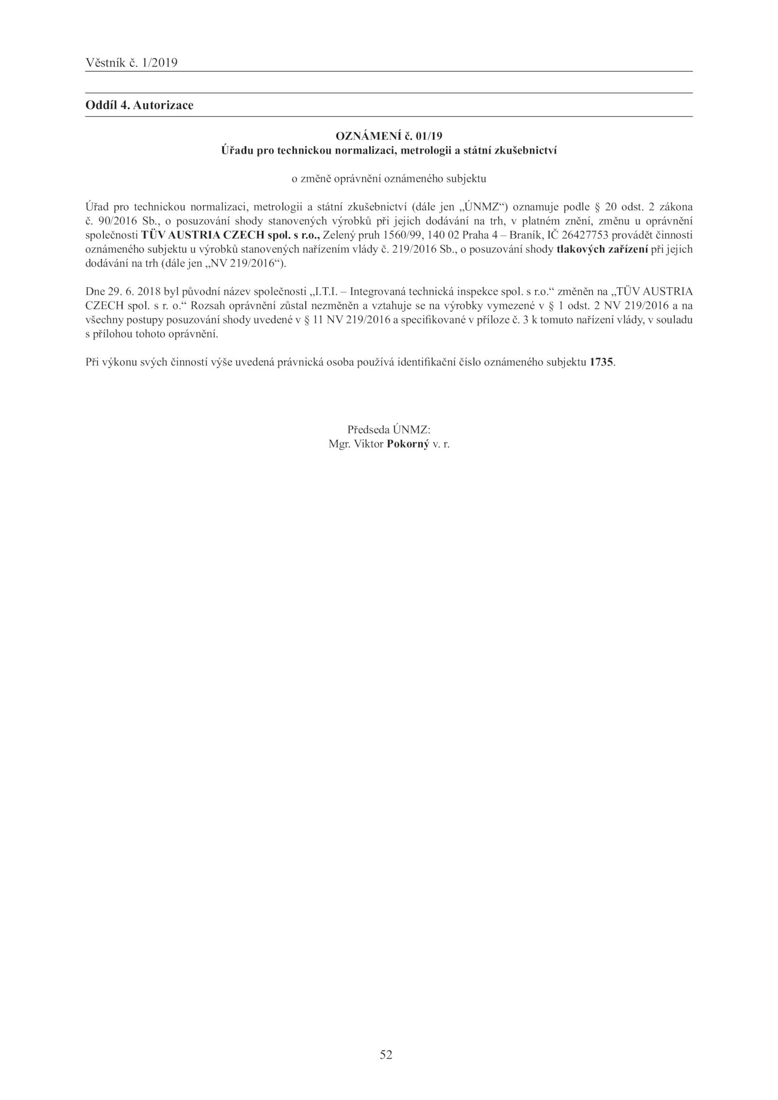 Úřad pro technickou normalizaci, metrologii státní zkušebnictví (dále jen „ÚNMZ“) oznamuje podle odst.T. Viktor Pokorný r. r. 2018 byl původní název společnosti „I. o., posuzování shody tlakových zařízení při jejich