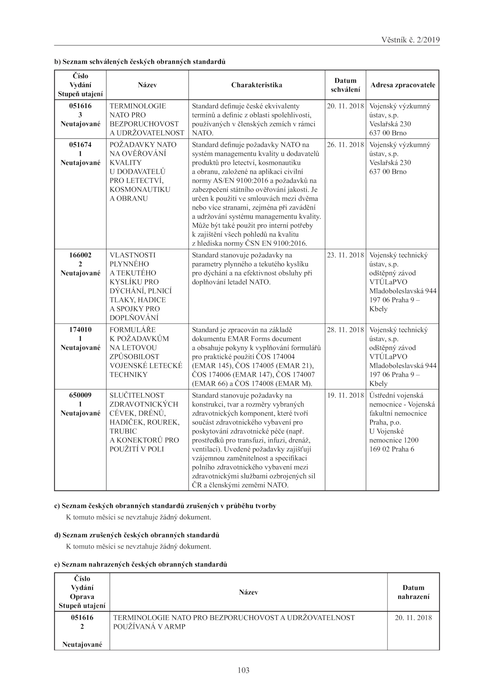 c) Seznam českých obranných standardů zrušených průběhu tvorby