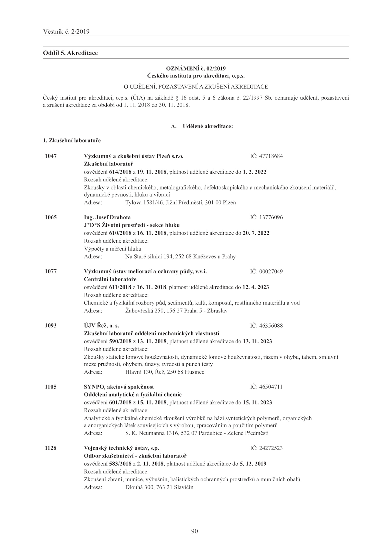 Českého institutu pro akreditaci, o. 2018, platnost udělené akreditace 20.s. Zkušební laboratoře