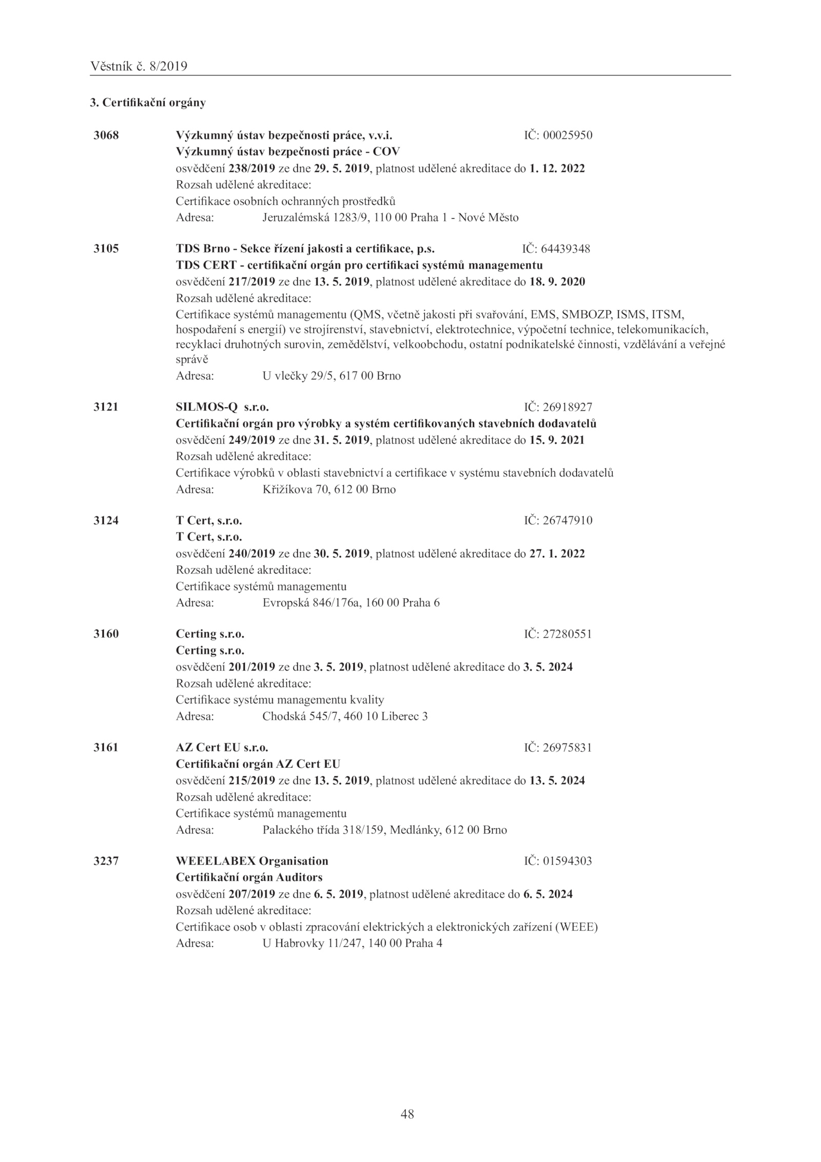 osvědčení 240/2019 dne 30. Certifikační orgány
