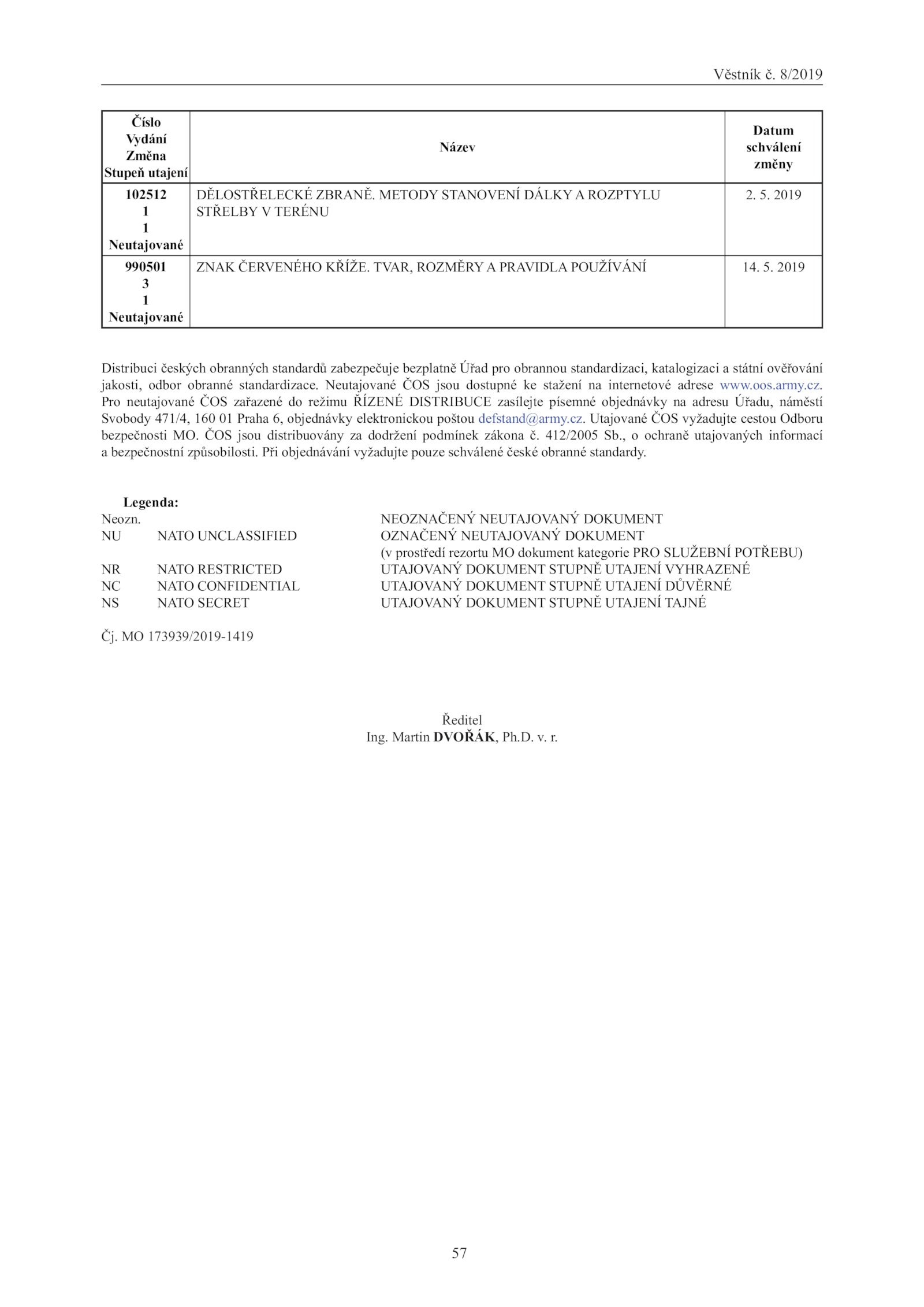 bezpečnosti MO. r. ČOS jsou distribuovány dodržení podmínek zákona 412/2005 Sb.Věstník 8/2019