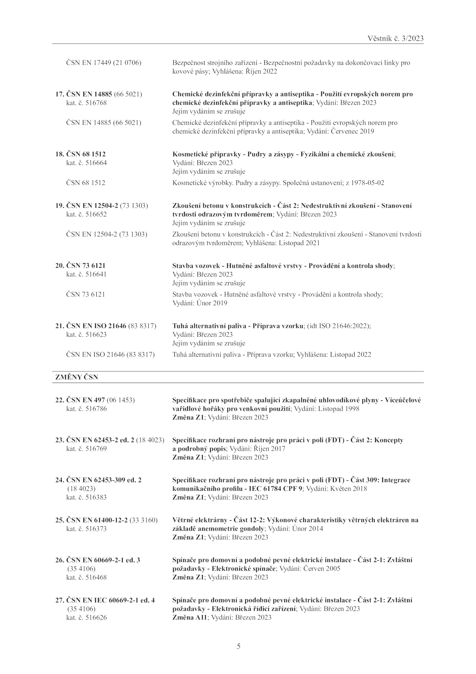 516769 Specifikace rozhraní pro nástroje pro práci poli (FDT) Část Koncepty a podrobný popis; Vydání: Říjen 2017 Změna Z1; Vydání: Březen 2023 24. 4 (35 4106) kat. 516768 Chemické dezinfekční přípravky antiseptika Použití evropských norem pro chemické dezinfekční přípravky antiseptika; Vydání: Březen 2023 Jejím vydáním zrušuje ČSN 14885 (66 5021) Chemické dezinfekční přípravky antiseptika Použití evropských norem pro chemické dezinfekční přípravky antiseptika; Vydání: Červenec 2019 18. ČSN 60669-2-1 ed. ČSN 6121 kat. 516786 Specifikace pro spotřebiče spalující zkapalněné uhlovodíkové plyny Víceúčelové vařidlové hořáky pro venkovní použití; Vydání: Listopad 1998 Změna Z1; Vydání: Březen 2023 23. 516373 Větrné elektrárny Část 12-2: Výkonové charakteristiky větrných elektráren na základě anemometrie gondoly; Vydání: Únor 2014 Změna Z1; Vydání: Březen 2023 26. ČSN 14885 (66 5021) kat. ČSN 1512 kat. 516652 Zkoušení betonu konstrukcích Část Nedestruktivní zkoušení Stanovení tvrdosti odrazovým tvrdoměrem; Vydání: Březen 2023 Jejím vydáním zrušuje ČSN 12504-2 (73 1303) Zkoušení betonu konstrukcích Část Nedestruktivní zkoušení Stanovení tvrdosti odrazovým tvrdoměrem; Vyhlášena: Listopad 2021 20. 516468 Spínače pro domovní podobné pevné elektrické instalace Část 2-1: Zvláštní požadavky Elektronické spínače; Vydání: Červen 2005 Změna Z1; Vydání: Březen 2023 27. ČSN IEC 60669-2-1 ed. (18 4023) kat. ČSN 497 (06 1453) kat. 516664 Kosmetické přípravky Pudry zásypy Fyzikální chemické zkoušení; Vydání: Březen 2023 Jejím vydáním zrušuje ČSN 1512 Kosmetické výrobky. ČSN 62453-2 ed. 516626 Spínače pro domovní podobné pevné elektrické instalace Část 2-1: Zvláštní požadavky Elektronická řídicí zařízení; Vydání: Březen 2023 Změna A11; Vydání: Březen 2023 . 516623 Tuhá alternativní paliva Příprava vzorku; (idt ISO 21646:2022); Vydání: Březen 2023 Jejím vydáním zrušuje ČSN ISO 21646 (83 8317) Tuhá alternativní paliva Příprava vzorku; Vyhlášena: Listopad 2022 ZMĚNY ČSN 22.5 Věstník 3/2023 ČSN 17449 (21 0706) Bezpečnost strojního zařízení Bezpečnostní požadavky dokončovací linky pro kovové pásy; Vyhlášena: Říjen 2022 17. 516383 Specifikace rozhraní pro nástroje pro práci poli (FDT) Část 309: Integrace komunikačního profilu IEC 61784 CPF Vydání: Květen 2018 Změna Z1; Vydání: Březen 2023 25. ČSN 61400-12-2 (33 3160) kat. Společná ustanovení; 1978-05-02 19. ČSN 12504-2 (73 1303) kat. ČSN 62453-309 ed. 2 (18 4023) kat. 3 (35 4106) kat. 516641 Stavba vozovek Hutněné asfaltové vrstvy Provádění kontrola shody; Vydání: Březen 2023 Jejím vydáním zrušuje ČSN 6121 Stavba vozovek Hutněné asfaltové vrstvy Provádění kontrola shody; Vydání: Únor 2019 21. ČSN ISO 21646 (83 8317) kat. Pudry zásypy