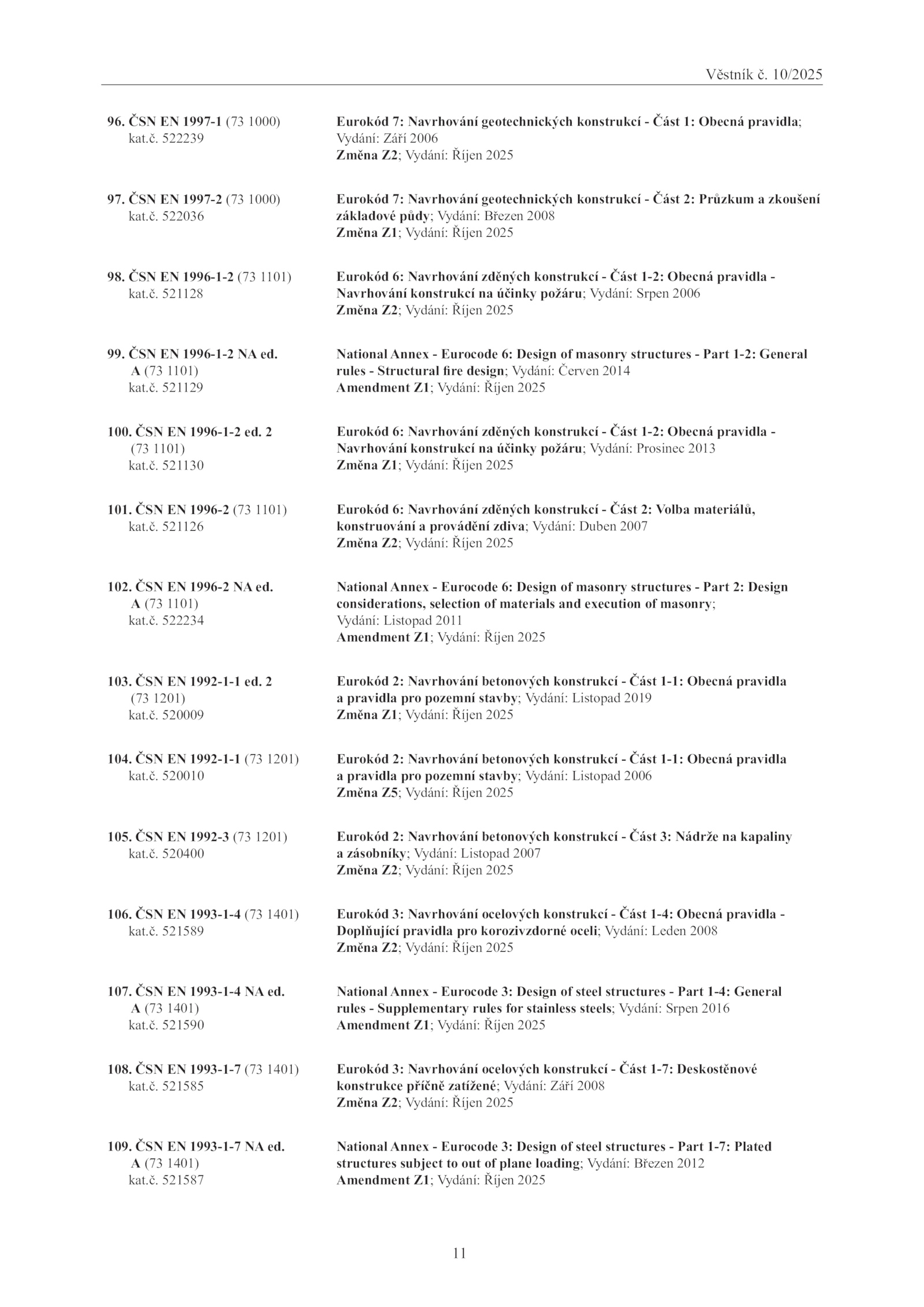 č. 522239 Eurokód Navrhování geotechnických konstrukcí Část Obecná pravidla; Vydání: Září 2006 Změna Z2; Vydání: Říjen 2025 97. 522234 National Annex Eurocode Design masonry structures Part Design considerations, selection materials and execution masonry; Vydání: Listopad 2011 Amendment Z1; Vydání: Říjen 2025 103. 521585 Eurokód Navrhování ocelových konstrukcí Část 1-7: Deskostěnové konstrukce příčně zatížené; Vydání: Září 2008 Změna Z2; Vydání: Říjen 2025 109. ČSN 1993-1-4 (73 1401) kat.č. ČSN 1993-1-4 ed. 521587 National Annex Eurocode Design steel structures Part 1-7: Plated structures subject out plane loading; Vydání: Březen 2012 Amendment Z1; Vydání: Říjen 2025 . ČSN 1996-2 ed.č. 522036 Eurokód Navrhování geotechnických konstrukcí Část Průzkum zkoušení základové půdy; Vydání: Březen 2008 Změna Z1; Vydání: Říjen 2025 98.č. A (73 1401) kat. 521126 Eurokód Navrhování zděných konstrukcí Část Volba materiálů, konstruování provádění zdiva; Vydání: Duben 2007 Změna Z2; Vydání: Říjen 2025 102. 2 (73 1101) kat.č. 520009 Eurokód Navrhování betonových konstrukcí Část 1-1: Obecná pravidla a pravidla pro pozemní stavby; Vydání: Listopad 2019 Změna Z1; Vydání: Říjen 2025 104. A (73 1101) kat. 521589 Eurokód Navrhování ocelových konstrukcí Část 1-4: Obecná pravidla - Doplňující pravidla pro korozivzdorné oceli; Vydání: Leden 2008 Změna Z2; Vydání: Říjen 2025 107. A (73 1401) kat. ČSN 1992-1-1 (73 1201) kat. ČSN 1997-2 (73 1000) kat. ČSN 1996-1-2 (73 1101) kat. ČSN 1997-1 (73 1000) kat. ČSN 1992-3 (73 1201) kat. 2 (73 1201) kat.č. ČSN 1993-1-7 (73 1401) kat. 521129 National Annex Eurocode Design masonry structures Part 1-2: General rules Structural fire design; Vydání: Červen 2014 Amendment Z1; Vydání: Říjen 2025 100. ČSN 1996-2 (73 1101) kat.č. 521128 Eurokód Navrhování zděných konstrukcí Část 1-2: Obecná pravidla - Navrhování konstrukcí účinky požáru; Vydání: Srpen 2006 Změna Z2; Vydání: Říjen 2025 99. ČSN 1996-1-2 ed.č. A (73 1101) kat. ČSN 1993-1-7 ed. ČSN 1992-1-1 ed. 520010 Eurokód Navrhování betonových konstrukcí Část 1-1: Obecná pravidla a pravidla pro pozemní stavby; Vydání: Listopad 2006 Změna Z5; Vydání: Říjen 2025 105.č.11 Věstník 10/2025 96. 521130 Eurokód Navrhování zděných konstrukcí Část 1-2: Obecná pravidla - Navrhování konstrukcí účinky požáru; Vydání: Prosinec 2013 Změna Z1; Vydání: Říjen 2025 101.č. 521590 National Annex Eurocode Design steel structures Part 1-4: General rules Supplementary rules for stainless steels; Vydání: Srpen 2016 Amendment Z1; Vydání: Říjen 2025 108.č.č. ČSN 1996-1-2 ed.č. 520400 Eurokód Navrhování betonových konstrukcí Část Nádrže kapaliny a zásobníky; Vydání: Listopad 2007 Změna Z2; Vydání: Říjen 2025 106.č