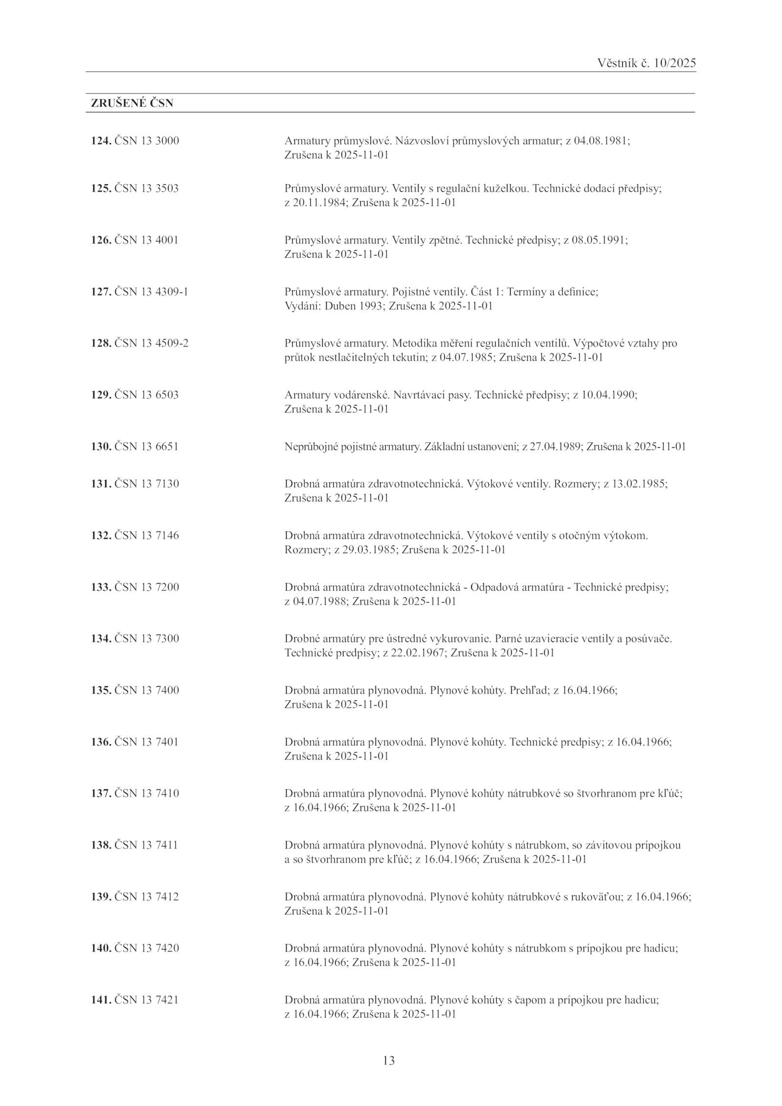 ČSN 7420 Drobná armatúra plynovodná.13 Věstník 10/2025 ZRUŠENÉ ČSN 124. ČSN 4001 Průmyslové armatury. Plynové kohúty nátrubkové štvorhranom pre kľúč; z 16.1967; Zrušena 2025-11-01 135. ČSN 3000 Armatury průmyslové. Plynové kohúty. ČSN 7410 Drobná armatúra plynovodná.1985; Zrušena 2025-11-01 132. ČSN 6503 Armatury vodárenské.1981; Zrušena 2025-11-01 125.04. Ventily zpětné. Výpočtové vztahy pro průtok nestlačitelných tekutin; 04. Technické předpisy; 10. ČSN 7411 Drobná armatúra plynovodná.1966; Zrušena 2025-11-01 139. Část Termíny definice; Vydání: Duben 1993; Zrušena 2025-11-01 128. ČSN 7300 Drobné armatúry pre ústredné vykurovanie. Prehľad; 16.1966; Zrušena 2025-11-01 138.07.04.05. ČSN 4509-2 Průmyslové armatury. Technické predpisy; 16.1966; Zrušena 2025-11-01 137. Názvosloví průmyslových armatur; 04. ČSN 7412 Drobná armatúra plynovodná. ČSN 7400 Drobná armatúra plynovodná.04. Metodika měření regulačních ventilů.02.1990; Zrušena 2025-11-01 130.1985; Zrušena 2025-11-01 133.1985; Zrušena 2025-11-01 129. Navrtávací pasy.04.08.1984; Zrušena 2025-11-01 126.1966; Zrušena 2025-11-01 . Výtokové ventily. Ventily regulační kuželkou. Plynové kohúty čapom prípojkou pre hadicu; z 16. ČSN 7130 Drobná armatúra zdravotnotechnická. Pojistné ventily.1966; Zrušena 2025-11-01 141.1991; Zrušena 2025-11-01 127. Plynové kohúty nátrubkové rukoväťou; 16.04.07. Rozmery; 29.11.1966; Zrušena 2025-11-01 140.04.03.04. Plynové kohúty. Technické predpisy; 22.02. ČSN 6651 Neprůbojné pojistné armatury. Plynové kohúty nátrubkom prípojkou pre hadicu; z 16. ČSN 7421 Drobná armatúra plynovodná. ČSN 7401 Drobná armatúra plynovodná. Technické dodací předpisy; z 20. Základní ustanovení; 27. Výtokové ventily otočným výtokom. Parné uzavieracie ventily posúvače. Technické předpisy; 08.1988; Zrušena 2025-11-01 134. ČSN 4309-1 Průmyslové armatury. Plynové kohúty nátrubkom, závitovou prípojkou a štvorhranom pre kľúč; 16.04.1989; Zrušena 2025-11-01 131. Rozmery; 13.04. ČSN 7200 Drobná armatúra zdravotnotechnická Odpadová armatúra Technické predpisy; z 04. ČSN 3503 Průmyslové armatury. ČSN 7146 Drobná armatúra zdravotnotechnická.1966; Zrušena 2025-11-01 136