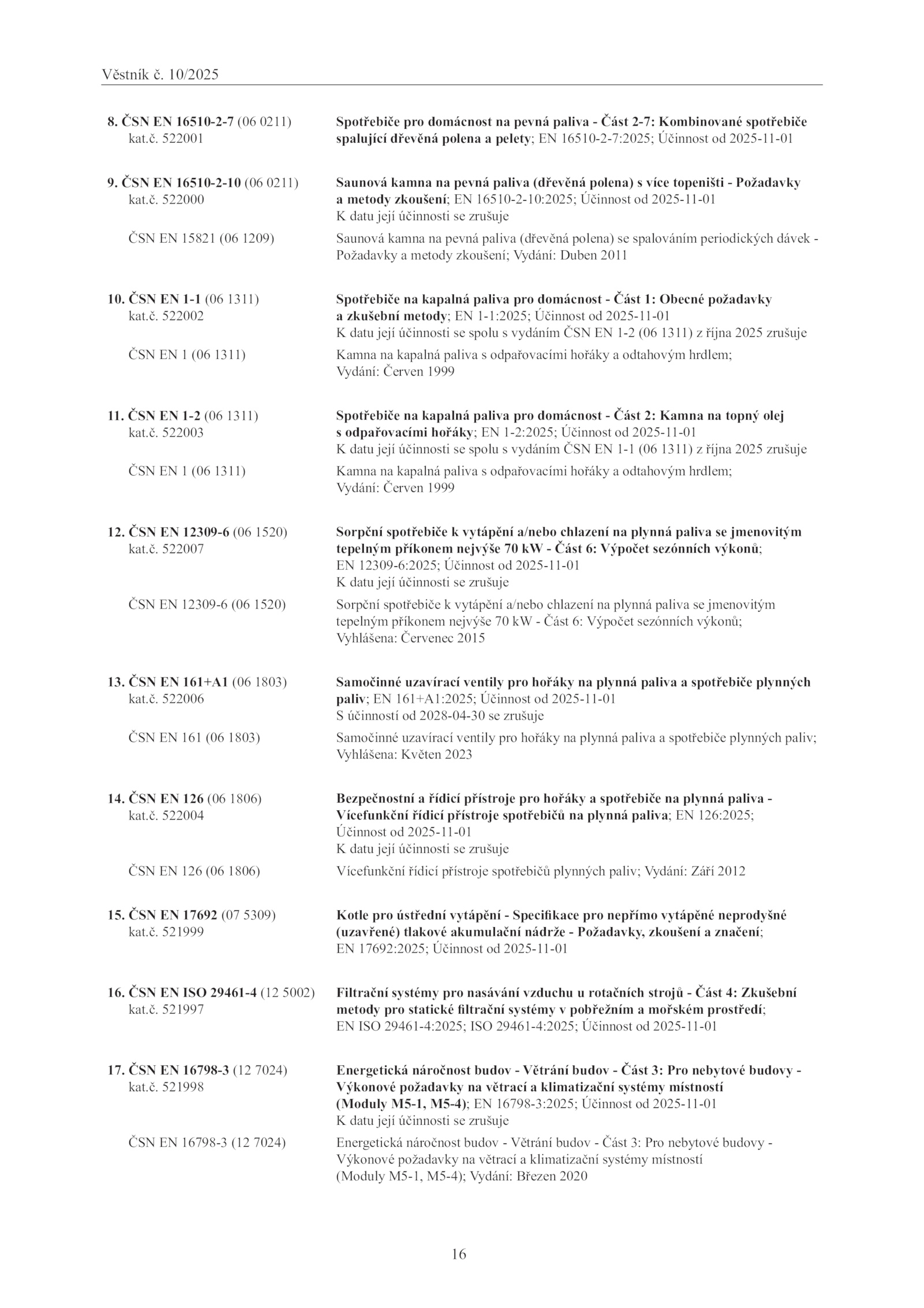 ČSN ISO 29461-4 (12 5002) kat. ČSN 1-2 (06 1311) kat. ČSN 16798-3 (12 7024) kat.č.č. 521998 Energetická náročnost budov Větrání budov Část Pro nebytové budovy - Výkonové požadavky větrací klimatizační systémy místností (Moduly M5-1, M5-4); 16798-3:2025; Účinnost 2025-11-01 K datu její účinnosti zrušuje ČSN 16798-3 (12 7024) Energetická náročnost budov Větrání budov Část Pro nebytové budovy - Výkonové požadavky větrací klimatizační systémy místností (Moduly M5-1, M5-4); Vydání: Březen 2020 . ČSN 12309-6 (06 1520) kat. 521997 Filtrační systémy pro nasávání vzduchu rotačních strojů Část Zkušební metody pro statické filtrační systémy pobřežním mořském prostředí; EN ISO 29461-4:2025; ISO 29461-4:2025; Účinnost 2025-11-01 17. ČSN 126 (06 1806) kat. ČSN 16510-2-10 (06 0211) kat.č. ČSN 17692 (07 5309) kat.č. ČSN 1-1 (06 1311) kat. 522002 Spotřebiče kapalná paliva pro domácnost Část Obecné požadavky a zkušební metody; 1-1:2025; Účinnost 2025-11-01 K datu její účinnosti spolu vydáním ČSN 1-2 (06 1311) října 2025 zrušuje ČSN (06 1311) Kamna kapalná paliva odpařovacími hořáky odtahovým hrdlem; Vydání: Červen 1999 11. 522000 Saunová kamna pevná paliva (dřevěná polena) více topeništi Požadavky a metody zkoušení; 16510-2-10:2025; Účinnost 2025-11-01 K datu její účinnosti zrušuje ČSN 15821 (06 1209) Saunová kamna pevná paliva (dřevěná polena) spalováním periodických dávek - Požadavky metody zkoušení; Vydání: Duben 2011 10. ČSN 161+A1 (06 1803) kat. 522007 Sorpční spotřebiče vytápění a/nebo chlazení plynná paliva jmenovitým tepelným příkonem nejvýše Část Výpočet sezónních výkonů; EN 12309-6:2025; Účinnost 2025-11-01 K datu její účinnosti zrušuje ČSN 12309-6 (06 1520) Sorpční spotřebiče vytápění a/nebo chlazení plynná paliva jmenovitým tepelným příkonem nejvýše Část Výpočet sezónních výkonů; Vyhlášena: Červenec 2015 13. 522003 Spotřebiče kapalná paliva pro domácnost Část Kamna topný olej s odpařovacími hořáky; 1-2:2025; Účinnost 2025-11-01 K datu její účinnosti spolu vydáním ČSN 1-1 (06 1311) října 2025 zrušuje ČSN (06 1311) Kamna kapalná paliva odpařovacími hořáky odtahovým hrdlem; Vydání: Červen 1999 12. 522001 Spotřebiče pro domácnost pevná paliva Část 2-7: Kombinované spotřebiče spalující dřevěná polena pelety; 16510-2-7:2025; Účinnost 2025-11-01 9.č.č.č.č. ČSN 16510-2-7 (06 0211) kat. 522006 Samočinné uzavírací ventily pro hořáky plynná paliva spotřebiče plynných paliv; 161+A1:2025; Účinnost 2025-11-01 S účinností 2028-04-30 zrušuje ČSN 161 (06 1803) Samočinné uzavírací ventily pro hořáky plynná paliva spotřebiče plynných paliv; Vyhlášena: Květen 2023 14. 522004 Bezpečnostní řídicí přístroje pro hořáky spotřebiče plynná paliva - Vícefunkční řídicí přístroje spotřebičů plynná paliva; 126:2025; Účinnost 2025-11-01 K datu její účinnosti zrušuje ČSN 126 (06 1806) Vícefunkční řídicí přístroje spotřebičů plynných paliv; Vydání: Září 2012 15.č.Věstník 10/2025 16 8. 521999 Kotle pro ústřední vytápění Specifikace pro nepřímo vytápěné neprodyšné (uzavřené) tlakové akumulační nádrže Požadavky, zkoušení značení; EN 17692:2025; Účinnost 2025-11-01 16.č