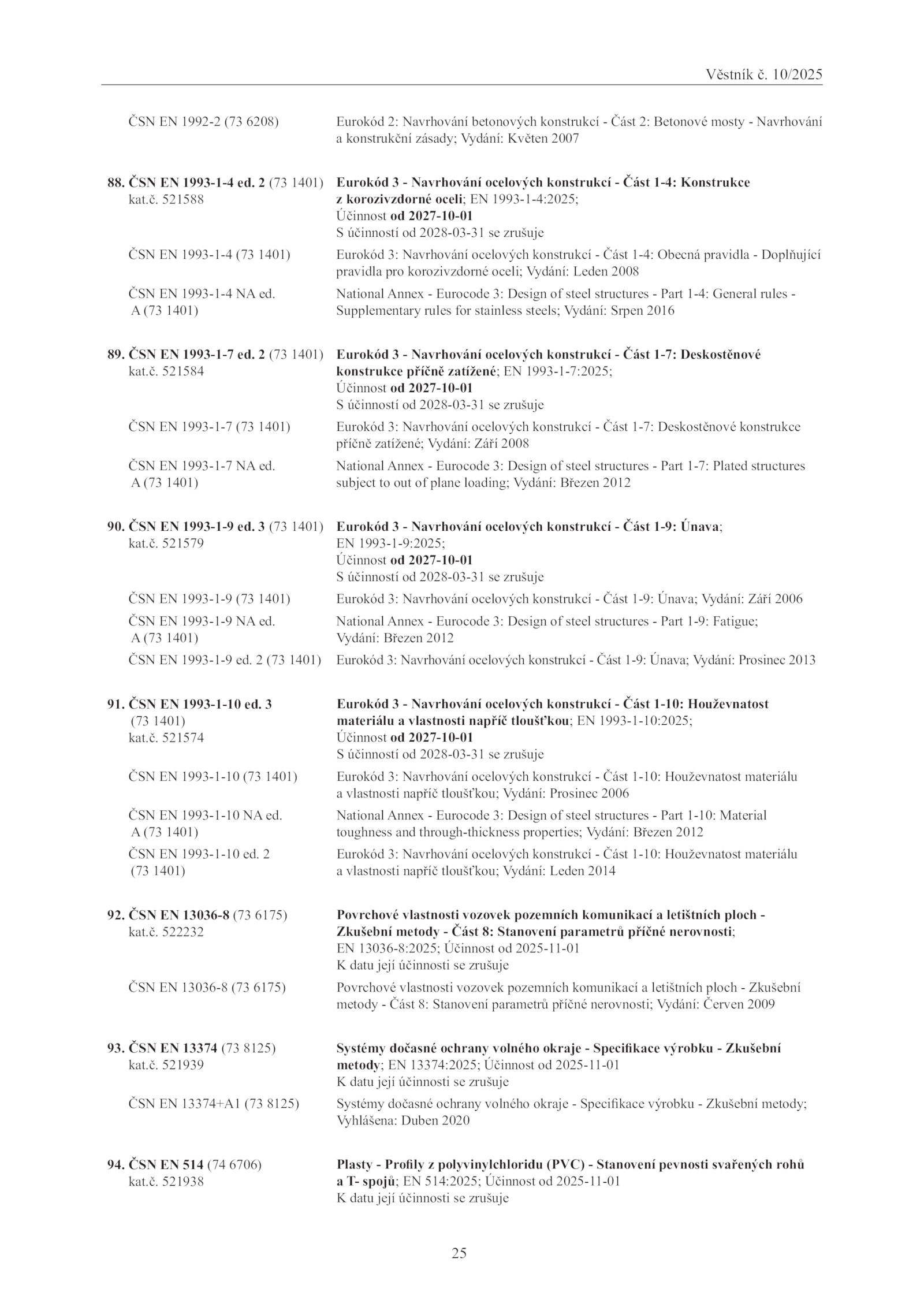 (73 1401) kat.č.25 Věstník 10/2025 ČSN 1992-2 (73 6208) Eurokód Navrhování betonových konstrukcí Část Betonové mosty Navrhování a konstrukční zásady; Vydání: Květen 2007 88. 521584 Eurokód Navrhování ocelových konstrukcí Část 1-7: Deskostěnové konstrukce příčně zatížené; 1993-1-7:2025; Účinnost 2027-10-01 S účinností 2028-03-31 zrušuje ČSN 1993-1-7 (73 1401) Eurokód Navrhování ocelových konstrukcí Část 1-7: Deskostěnové konstrukce příčně zatížené; Vydání: Září 2008 ČSN 1993-1-7 ed.č. 521588 Eurokód Navrhování ocelových konstrukcí Část 1-4: Konstrukce z korozivzdorné oceli; 1993-1-4:2025; Účinnost 2027-10-01 S účinností 2028-03-31 zrušuje ČSN 1993-1-4 (73 1401) Eurokód Navrhování ocelových konstrukcí Část 1-4: Obecná pravidla Doplňující pravidla pro korozivzdorné oceli; Vydání: Leden 2008 ČSN 1993-1-4 ed. A (73 1401) National Annex Eurocode Design steel structures Part 1-9: Fatigue; Vydání: Březen 2012 ČSN 1993-1-9 ed. A (73 1401) National Annex Eurocode Design steel structures Part 1-4: General rules - Supplementary rules for stainless steels; Vydání: Srpen 2016 89. 2 (73 1401) Eurokód Navrhování ocelových konstrukcí Část 1-10: Houževnatost materiálu a vlastnosti napříč tloušťkou; Vydání: Leden 2014 92. (73 1401) kat. 522232 Povrchové vlastnosti vozovek pozemních komunikací letištních ploch - Zkušební metody Část Stanovení parametrů příčné nerovnosti; EN 13036-8:2025; Účinnost 2025-11-01 K datu její účinnosti zrušuje ČSN 13036-8 (73 6175) Povrchové vlastnosti vozovek pozemních komunikací letištních ploch Zkušební metody Část Stanovení parametrů příčné nerovnosti; Vydání: Červen 2009 93.č. A (73 1401) National Annex Eurocode Design steel structures Part 1-7: Plated structures subject out plane loading; Vydání: Březen 2012 90. 3 (73 1401) kat.č. 521938 Plasty Profily polyvinylchloridu (PVC) Stanovení pevnosti svařených rohů a spojů; 514:2025; Účinnost 2025-11-01 K datu její účinnosti zrušuje . 521579 Eurokód Navrhování ocelových konstrukcí Část 1-9: Únava; EN 1993-1-9:2025; Účinnost 2027-10-01 S účinností 2028-03-31 zrušuje ČSN 1993-1-9 (73 1401) Eurokód Navrhování ocelových konstrukcí Část 1-9: Únava; Vydání: Září 2006 ČSN 1993-1-9 ed. 521574 Eurokód Navrhování ocelových konstrukcí Část 1-10: Houževnatost materiálu vlastnosti napříč tloušťkou; 1993-1-10:2025; Účinnost 2027-10-01 S účinností 2028-03-31 zrušuje ČSN 1993-1-10 (73 1401) Eurokód Navrhování ocelových konstrukcí Část 1-10: Houževnatost materiálu a vlastnosti napříč tloušťkou; Vydání: Prosinec 2006 ČSN 1993-1-10 ed. ČSN 1993-1-4 ed. A (73 1401) National Annex Eurocode Design steel structures Part 1-10: Material toughness and through-thickness properties; Vydání: Březen 2012 ČSN 1993-1-10 ed.č.č. ČSN 1993-1-7 ed. 521939 Systémy dočasné ochrany volného okraje Specifikace výrobku Zkušební metody; 13374:2025; Účinnost 2025-11-01 K datu její účinnosti zrušuje ČSN 13374+A1 (73 8125) Systémy dočasné ochrany volného okraje Specifikace výrobku Zkušební metody; Vyhlášena: Duben 2020 94. (73 1401) kat. ČSN 1993-1-10 ed. ČSN 13374 (73 8125) kat. ČSN 1993-1-9 ed.č. ČSN 514 (74 6706) kat. (73 1401) Eurokód Navrhování ocelových konstrukcí Část 1-9: Únava; Vydání: Prosinec 2013 91. ČSN 13036-8 (73 6175) kat