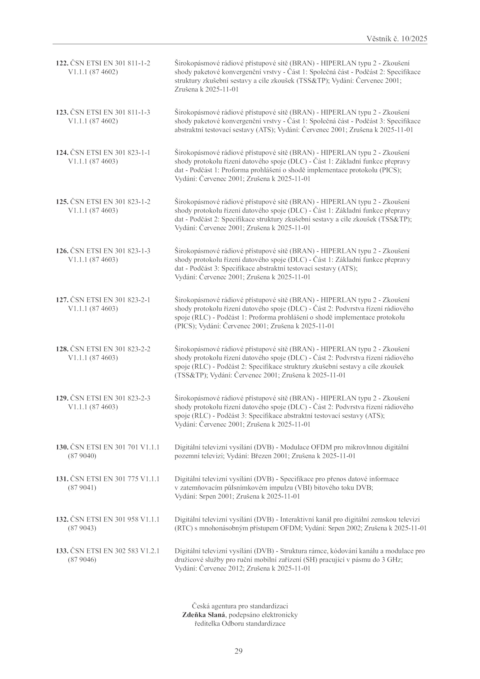 1. ČSN ETSI 301 701 V1. ČSN ETSI 301 811-1-2 V1.1 (87 4603) Širokopásmové rádiové přístupové sítě (BRAN) HIPERLAN typu Zkoušení shody protokolu řízení datového spoje (DLC) Část Základní funkce přepravy dat Podčást Specifikace abstraktní testovací sestavy (ATS); Vydání: Červenec 2001; Zrušena 2025-11-01 127. ČSN ETSI 301 823-1-2 V1. ČSN ETSI 301 775 V1. ČSN ETSI 301 823-1-3 V1.1.29 Věstník 10/2025 122. ČSN ETSI 302 583 V1.1 (87 9046) Digitální televizní vysílání (DVB) Struktura rámce, kódování kanálu modulace pro družicové služby pro ruční mobilní zařízení (SH) pracující pásmu GHz; Vydání: Červenec 2012; Zrušena 2025-11-01 Česká agentura pro standardizaci Zdeňka Slaná, podepsáno elektronicky ředitelka Odboru standardizace . ČSN ETSI 301 958 V1.1 (87 9040) Digitální televizní vysílání (DVB) Modulace OFDM pro mikrovlnnou digitální pozemní televizi; Vydání: Březen 2001; Zrušena 2025-11-01 131.1.1.1.1.1 (87 4603) Širokopásmové rádiové přístupové sítě (BRAN) HIPERLAN typu Zkoušení shody protokolu řízení datového spoje (DLC) Část Podvrstva řízení rádiového spoje (RLC) Podčást Specifikace struktury zkušební sestavy cíle zkoušek (TSS&TP); Vydání: Červenec 2001; Zrušena 2025-11-01 129.1 (87 4603) Širokopásmové rádiové přístupové sítě (BRAN) HIPERLAN typu Zkoušení shody protokolu řízení datového spoje (DLC) Část Základní funkce přepravy dat Podčást Specifikace struktury zkušební sestavy cíle zkoušek (TSS&TP); Vydání: Červenec 2001; Zrušena 2025-11-01 126. ČSN ETSI 301 823-2-1 V1.1 (87 4602) Širokopásmové rádiové přístupové sítě (BRAN) HIPERLAN typu Zkoušení shody paketové konvergenční vrstvy Část Společná část Podčást Specifikace abstraktní testovací sestavy (ATS); Vydání: Červenec 2001; Zrušena 2025-11-01 124.1. ČSN ETSI 301 823-1-1 V1. ČSN ETSI 301 823-2-2 V1.1.1 (87 4603) Širokopásmové rádiové přístupové sítě (BRAN) HIPERLAN typu Zkoušení shody protokolu řízení datového spoje (DLC) Část Podvrstva řízení rádiového spoje (RLC) Podčást Proforma prohlášení shodě implementace protokolu (PICS); Vydání: Červenec 2001; Zrušena 2025-11-01 128.1.1.2.1 (87 4602) Širokopásmové rádiové přístupové sítě (BRAN) HIPERLAN typu Zkoušení shody paketové konvergenční vrstvy Část Společná část Podčást Specifikace struktury zkušební sestavy cíle zkoušek (TSS&TP); Vydání: Červenec 2001; Zrušena 2025-11-01 123.1 (87 4603) Širokopásmové rádiové přístupové sítě (BRAN) HIPERLAN typu Zkoušení shody protokolu řízení datového spoje (DLC) Část Základní funkce přepravy dat Podčást Proforma prohlášení shodě implementace protokolu (PICS); Vydání: Červenec 2001; Zrušena 2025-11-01 125.1 (87 9041) Digitální televizní vysílání (DVB) Specifikace pro přenos datové informace v zatemňovacím půlsnímkovém impulzu (VBI) bitového toku DVB; Vydání: Srpen 2001; Zrušena 2025-11-01 132. ČSN ETSI 301 823-2-3 V1. ČSN ETSI 301 811-1-3 V1.1.1 (87 4603) Širokopásmové rádiové přístupové sítě (BRAN) HIPERLAN typu Zkoušení shody protokolu řízení datového spoje (DLC) Část Podvrstva řízení rádiového spoje (RLC) Podčást Specifikace abstraktní testovací sestavy (ATS); Vydání: Červenec 2001; Zrušena 2025-11-01 130.1 (87 9043) Digitální televizní vysílání (DVB) Interaktivní kanál pro digitální zemskou televizi (RTC) mnohonásobným přístupem OFDM; Vydání: Srpen 2002; Zrušena 2025-11-01 133