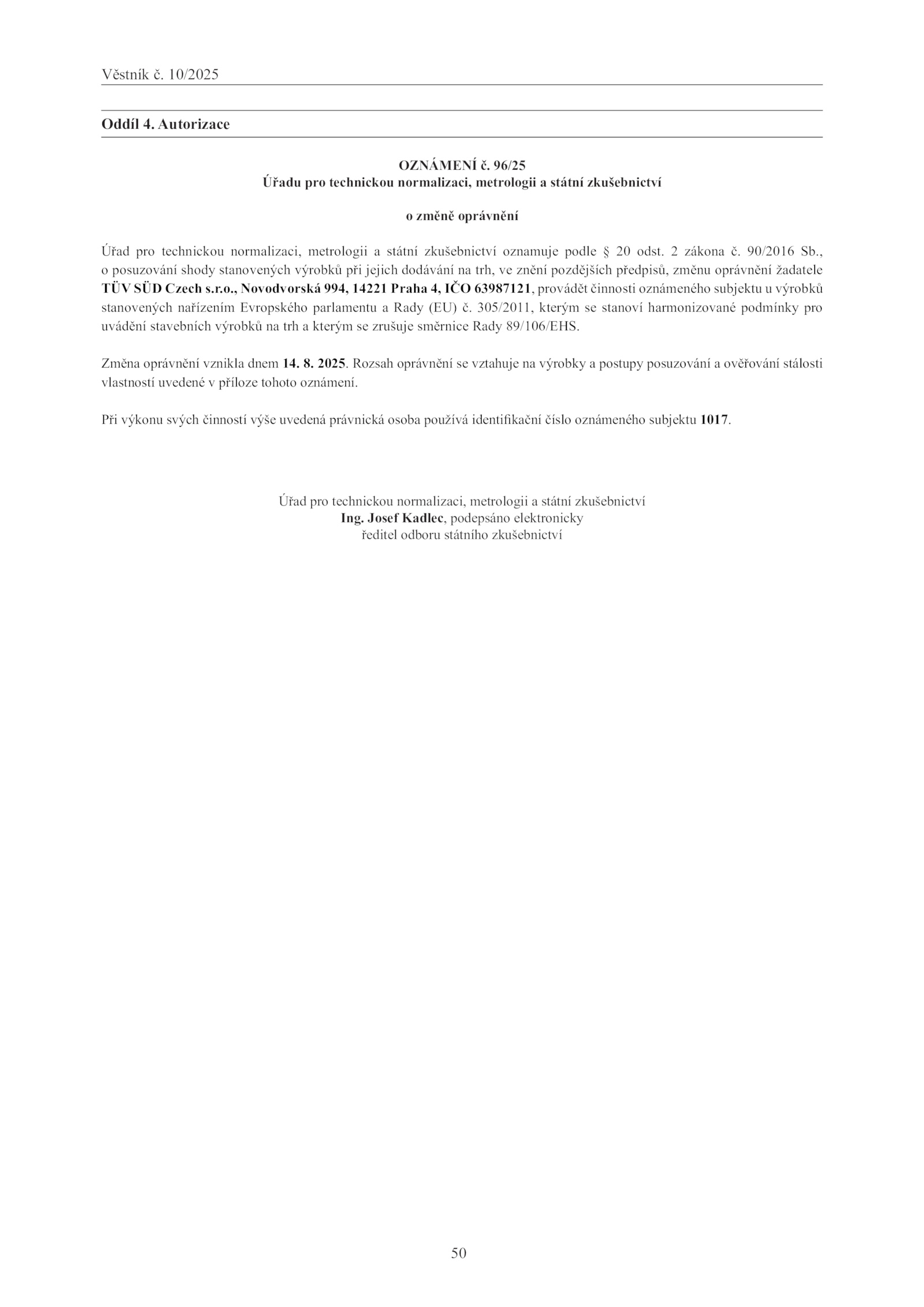 Změna oprávnění vznikla dnem 14.Věstník 10/2025