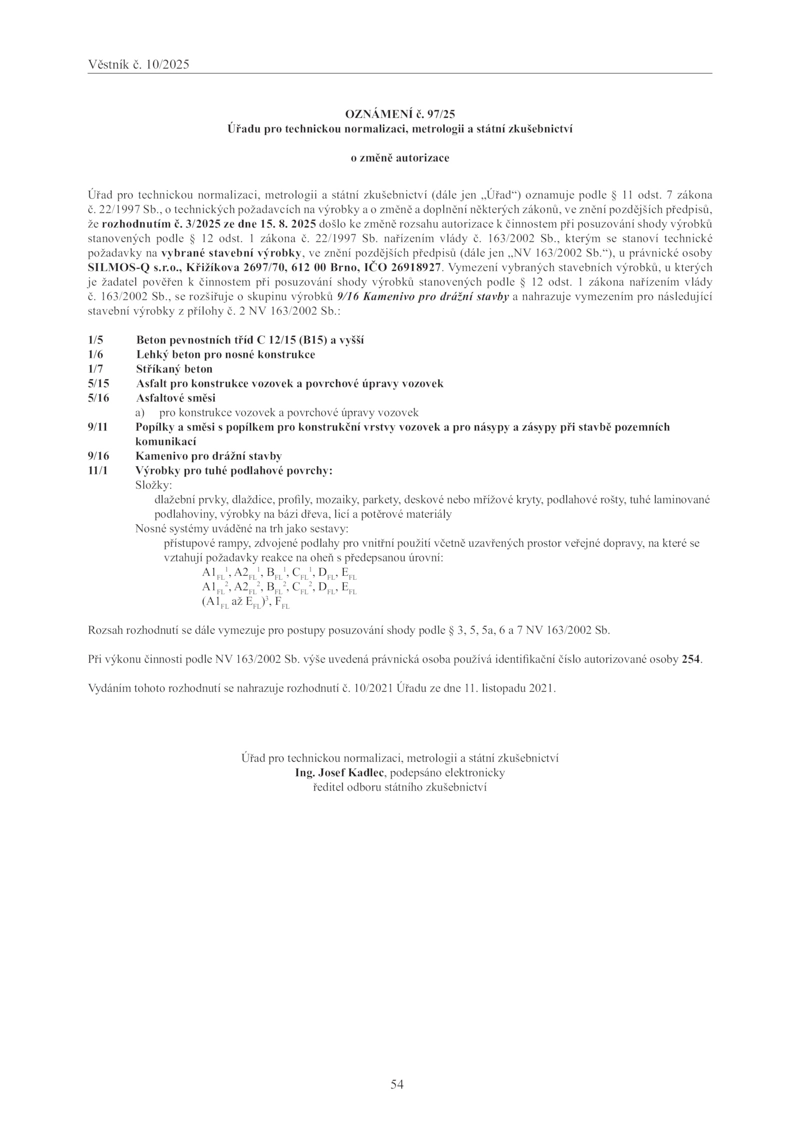 že rozhodnutím 3/2025 dne 15. výše uvedená právnická osoba používá identifikační číslo autorizované osoby 254. Josef Kadlec, podepsáno elektronicky