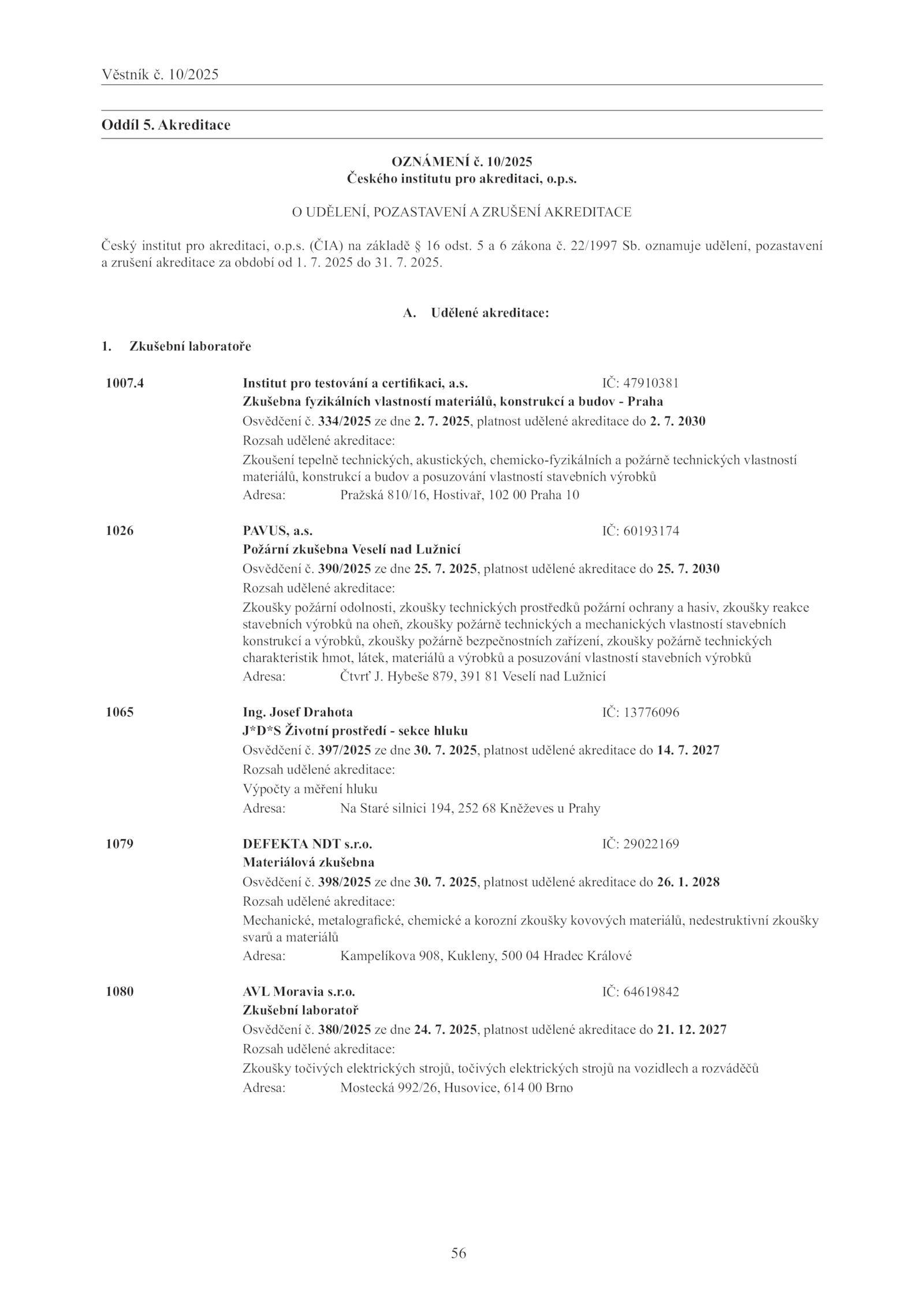 Osvědčení 398/2025 dne 30.Věstník 10/2025