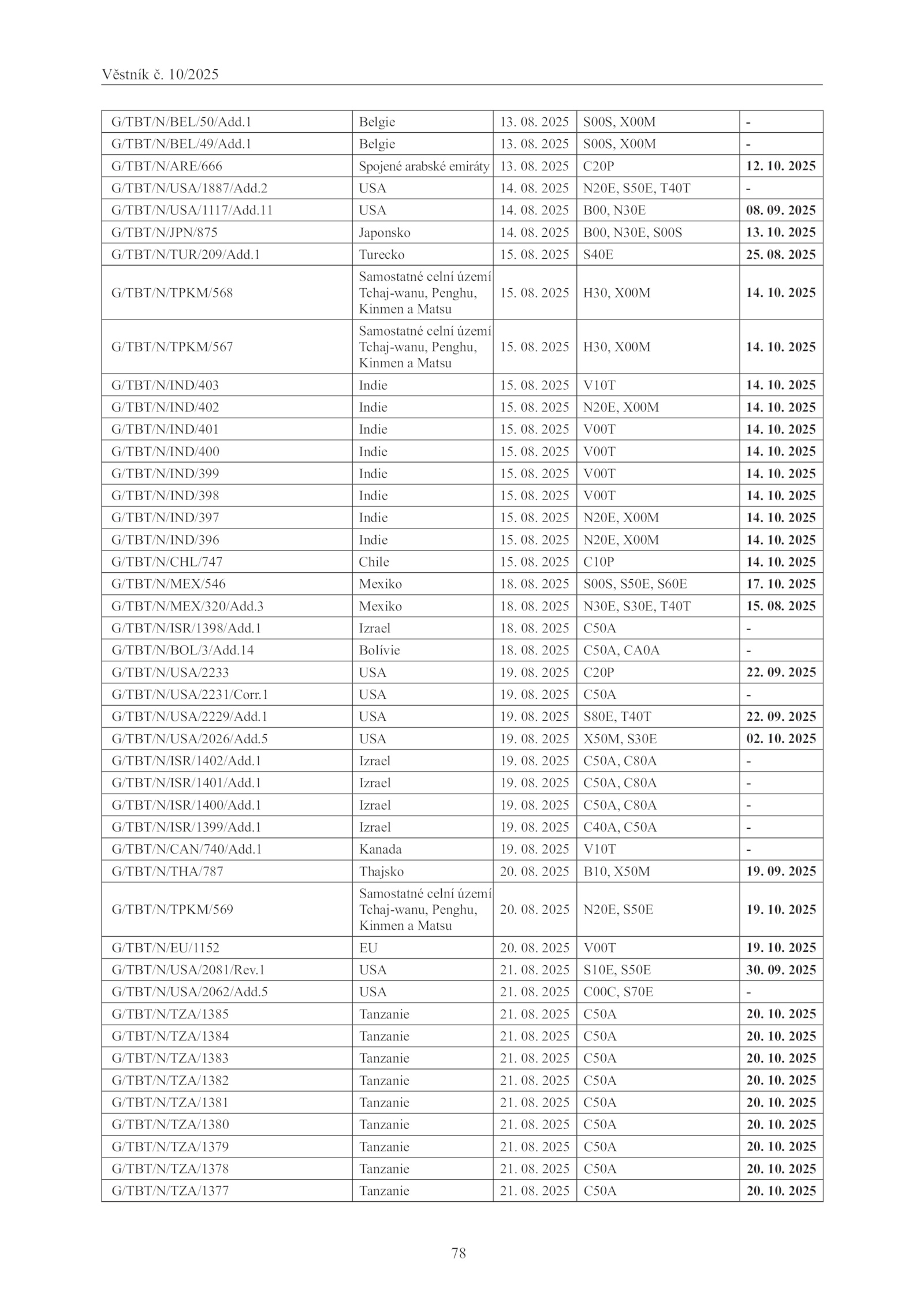 G/TBT/N/IND/402 Indie 15. 08. 2025 V00T 14.1 Izrael 19. 09. 10. 10. 2025 N20E, X00M 14. 08.1 Izrael 19. 08. 08. 10. 2025 B10, X50M 19. 2025