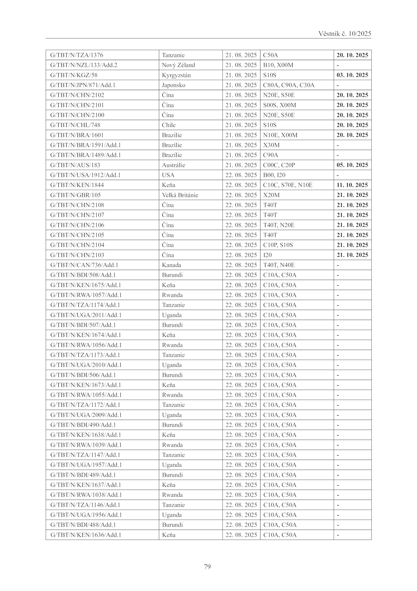 G/TBT/N/KEN/1637/Add. 10. 08. 08. 08. 10. 2025 T40T 21. 08. 08.2 Nový Zéland 21. 2025 C00C, C20P 05. 2025 C10A, C50A -
