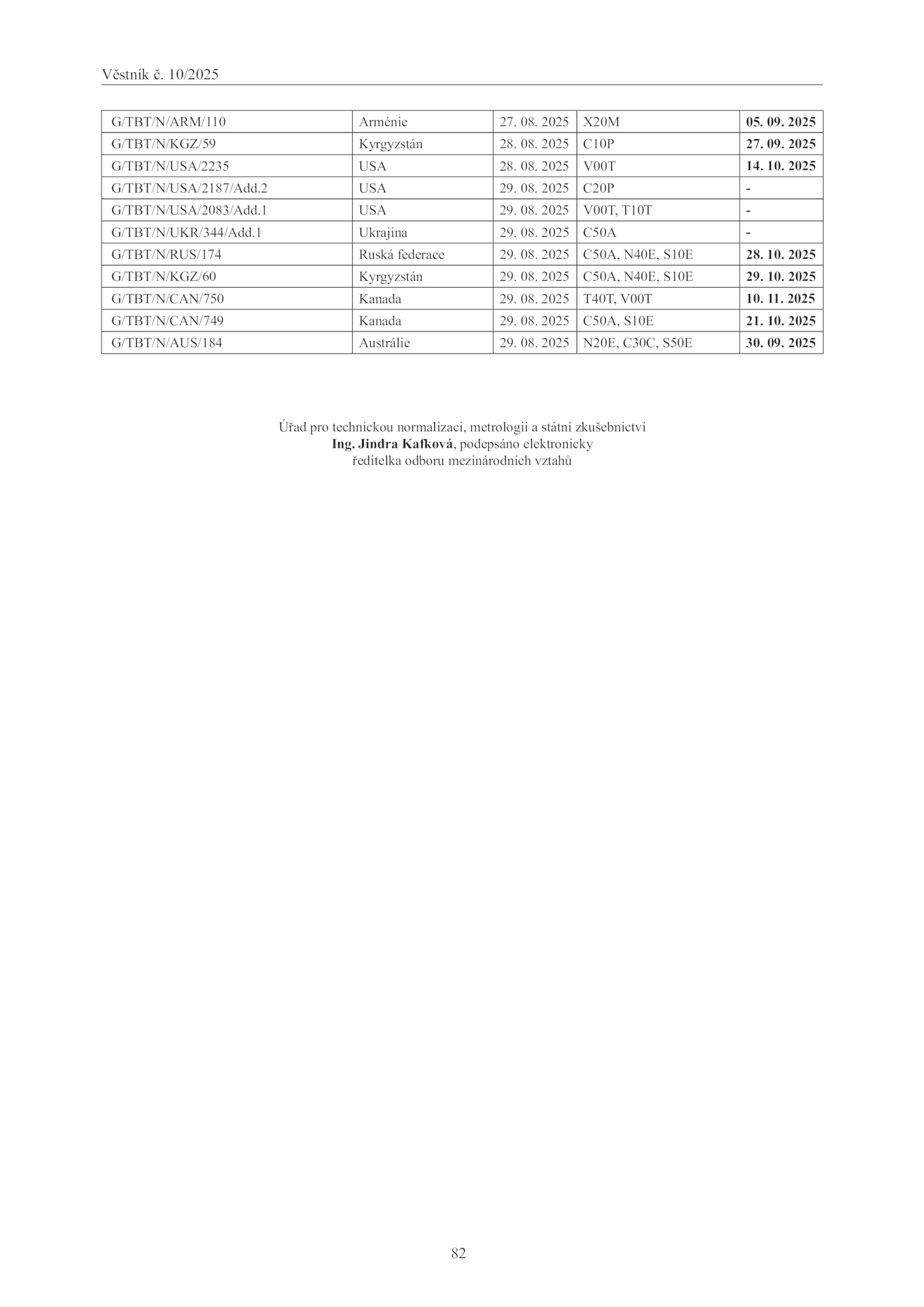 G/TBT/N/UKR/344/Add.1 Ukrajina 29. 08. 2025 N20E, C30C, S50E 30. 08. 10. 09. 2025 C50A, N40E, S10E 28. 2025
