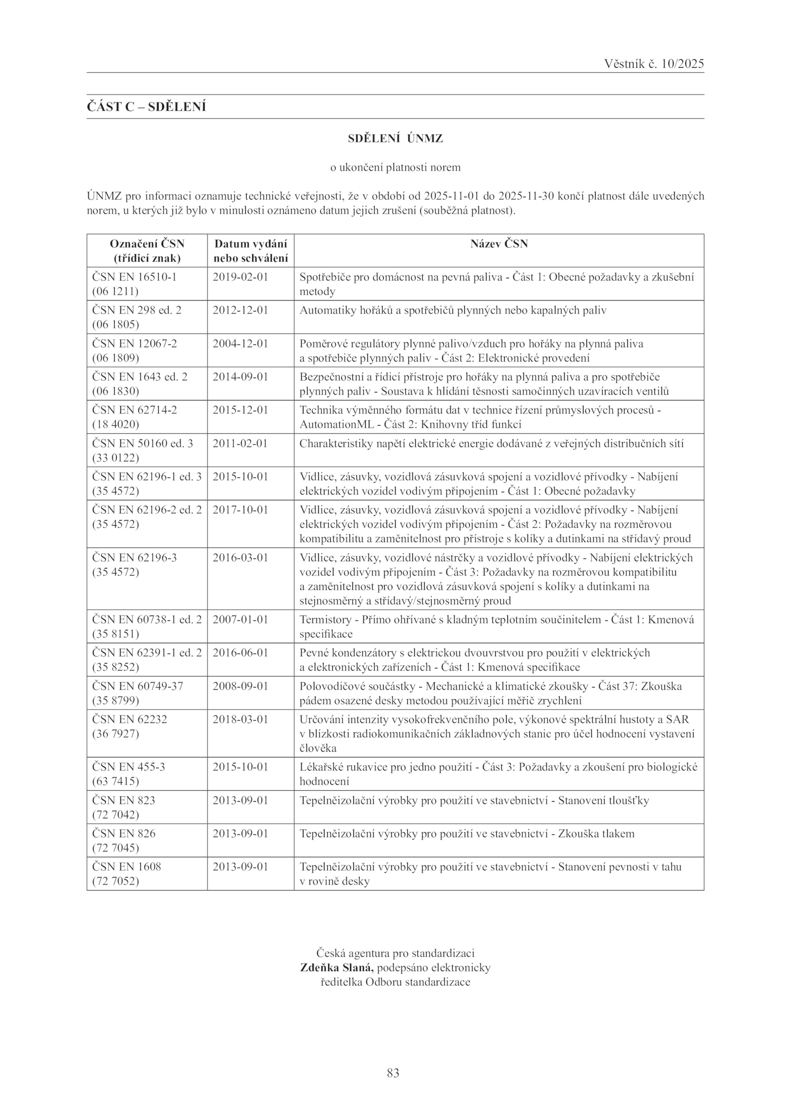 ÚNMZ pro informaci oznamuje technické veřejnosti, období 2025-11-01 2025-11-30 končí platnost dále uvedených