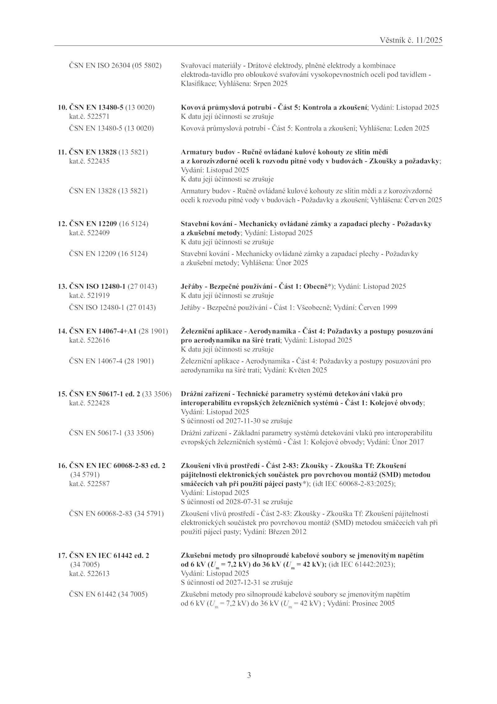 č. ČSN 14067-4+A1 (28 1901) kat. ČSN 13480-5 (13 0020) kat.č.č. 2 (34 5791) kat. ČSN ISO 12480-1 (27 0143) kat. 522409 Stavební kování Mechanicky ovládané zámky zapadací plechy Požadavky a zkušební metody; Vydání: Listopad 2025 K datu její účinnosti zrušuje ČSN 12209 (16 5124) Stavební kování Mechanicky ovládané zámky zapadací plechy Požadavky a zkušební metody; Vyhlášena: Únor 2025 13.č. 522587 Zkoušení vlivů prostředí Část 2-83: Zkoušky Zkouška Tf: Zkoušení pájitelnosti elektronických součástek pro povrchovou montáž (SMD) metodou smáčecích vah při použití pájecí pasty*); (idt IEC 60068-2-83:2025); Vydání: Listopad 2025 S účinností 2028-07-31 zrušuje ČSN 60068-2-83 (34 5791) Zkoušení vlivů prostředí Část 2-83: Zkoušky Zkouška Tf: Zkoušení pájitelnosti elektronických součástek pro povrchovou montáž (SMD) metodou smáčecích vah při použití pájecí pasty; Vydání: Březen 2012 17.č. (33 3506) kat. ČSN 13828 (13 5821) kat.č.3 Věstník 11/2025 ČSN ISO 26304 (05 5802) Svařovací materiály Drátové elektrody, plněné elektrody kombinace elektroda-tavidlo pro obloukové svařování vysokopevnostních ocelí pod tavidlem - Klasifikace; Vyhlášena: Srpen 2025 10. 522571 Kovová průmyslová potrubí Část Kontrola zkoušení; Vydání: Listopad 2025 K datu její účinnosti zrušuje ČSN 13480-5 (13 0020) Kovová průmyslová potrubí Část Kontrola zkoušení; Vyhlášena: Leden 2025 11.č. 522613 Zkušební metody pro silnoproudé kabelové soubory jmenovitým napětím od (Um = 7,2 kV) (Um = kV); (idt IEC 61442:2023); Vydání: Listopad 2025 S účinností 2027-12-31 zrušuje ČSN 61442 (34 7005) Zkušební metody pro silnoproudé kabelové soubory jmenovitým napětím od (Um = 7,2 kV) (Um = kV) Vydání: Prosinec 2005 . 522616 Železniční aplikace Aerodynamika Část Požadavky postupy posuzování pro aerodynamiku širé trati; Vydání: Listopad 2025 K datu její účinnosti zrušuje ČSN 14067-4 (28 1901) Železniční aplikace Aerodynamika Část Požadavky postupy posuzování pro aerodynamiku širé trati; Vydání: Květen 2025 15. 522435 Armatury budov Ručně ovládané kulové kohouty slitin mědi a korozivzdorné oceli rozvodu pitné vody budovách Zkoušky požadavky; Vydání: Listopad 2025 K datu její účinnosti zrušuje ČSN 13828 (13 5821) Armatury budov Ručně ovládané kulové kohouty slitin mědi korozivzdorné oceli rozvodu pitné vody budovách Požadavky zkoušení; Vyhlášena: Červen 2025 12. ČSN IEC 60068-2-83 ed. ČSN 12209 (16 5124) kat. ČSN IEC 61442 ed. 2 (34 7005) kat.č. 521919 Jeřáby Bezpečné používání Část Obecně*); Vydání: Listopad 2025 K datu její účinnosti zrušuje ČSN ISO 12480-1 (27 0143) Jeřáby Bezpečné používání Část Všeobecně; Vydání: Červen 1999 14. ČSN 50617-1 ed. 522428 Drážní zařízení Technické parametry systémů detekování vlaků pro interoperabilitu evropských železničních systémů Část Kolejové obvody; Vydání: Listopad 2025 S účinností 2027-11-30 zrušuje ČSN 50617-1 (33 3506) Drážní zařízení Základní parametry systémů detekování vlaků pro interoperabilitu evropských železničních systémů Část Kolejové obvody; Vydání: Únor 2017 16