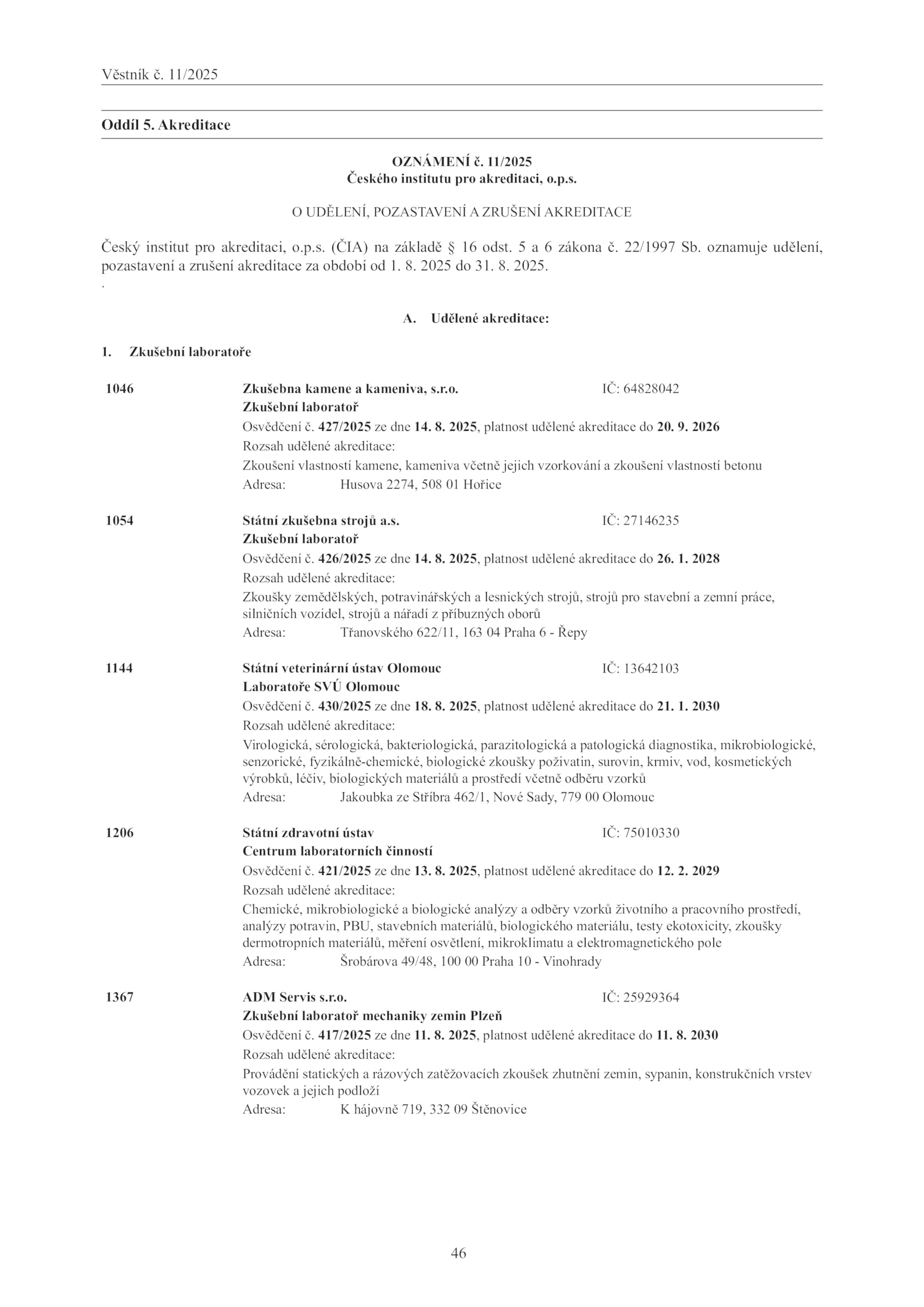 Osvědčení 421/2025 dne 13. 2025, platnost udělené akreditace 26.r.Věstník 11/2025