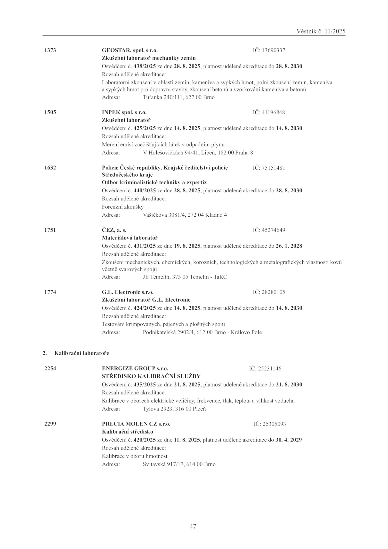 Osvědčení 424/2025 dne 14.o. 2025, platnost udělené akreditace 26.Věstník 11/2025