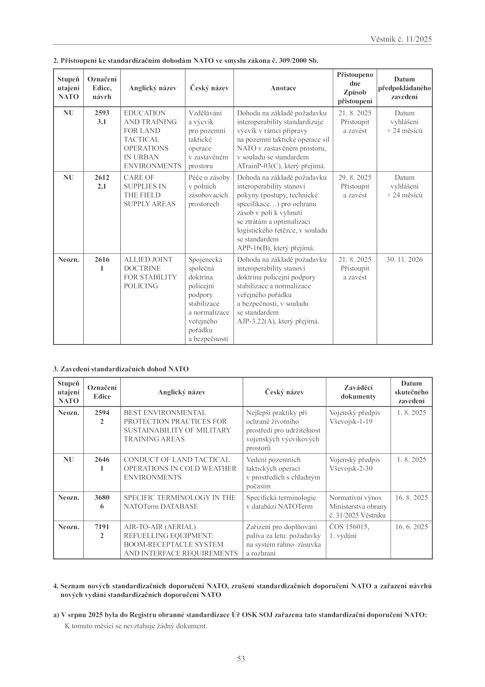 K tomuto měsíci nevztahuje žádný dokument. Přistoupení standardizačním dohodám NATO smyslu zákona 309/2000 Sb. 31/2025 Věstníku