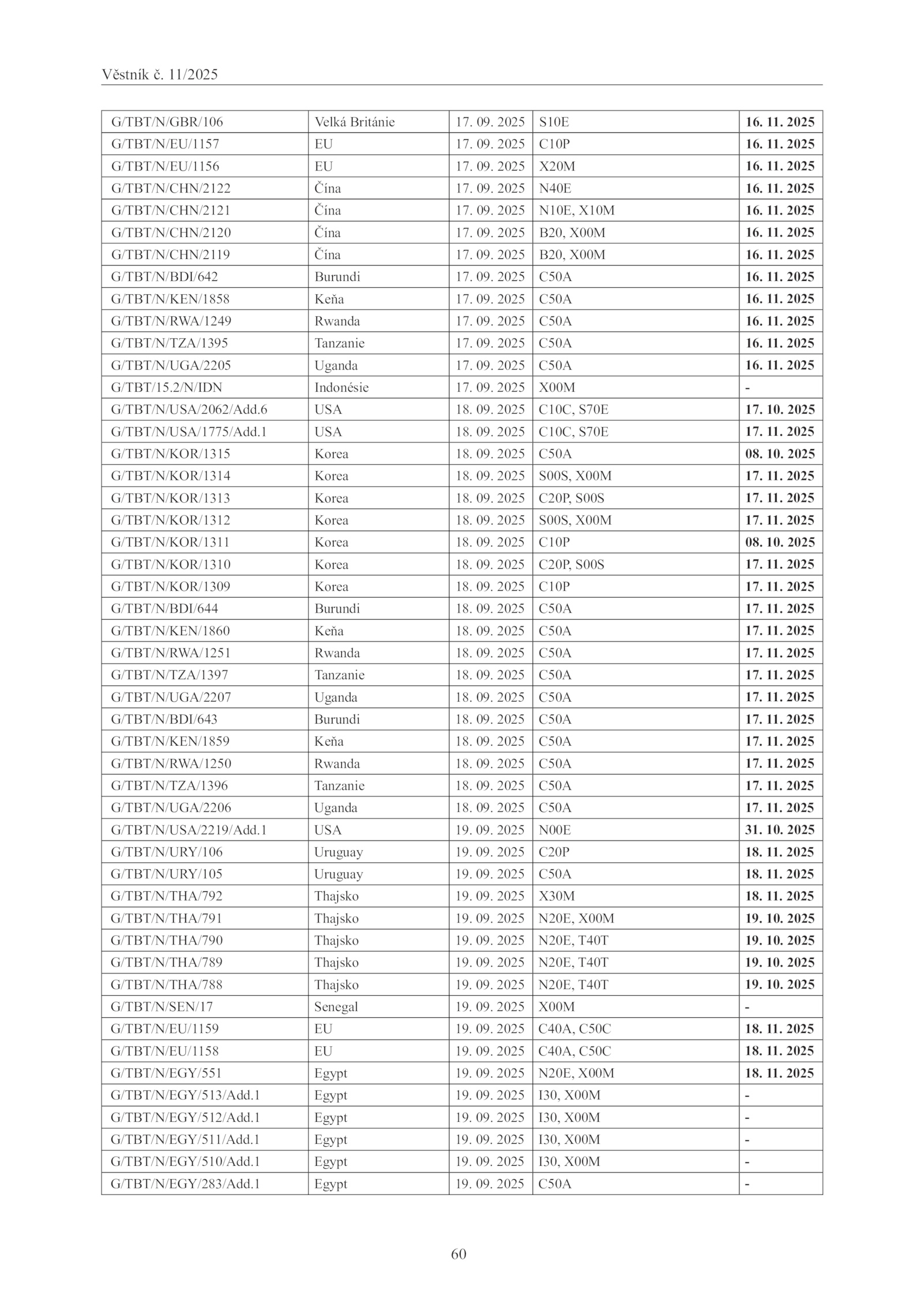 G/TBT/N/BDI/644 Burundi 18. 11. 2025 C50A 17. 2025 B20, X00M 16. 09. 2025