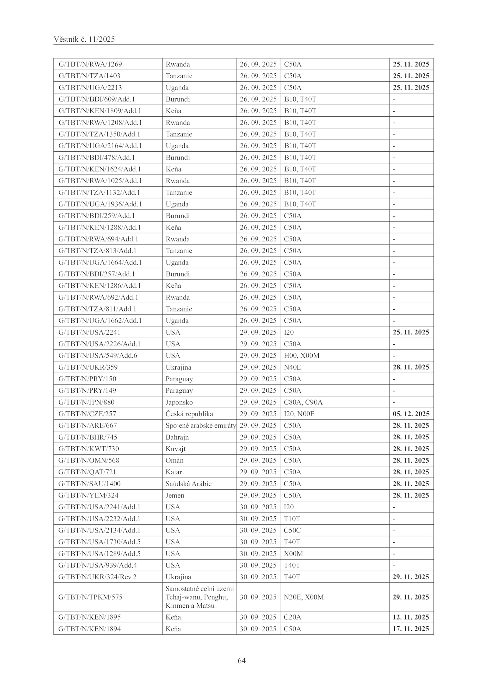 G/TBT/N/RWA/1208/Add.2 Ukrajina 30.1 Tanzanie 26. 2025 I20, N00E 05.4 USA 30.1 Tanzanie 26. 09.5 USA 30. 2025 B10, T40T -