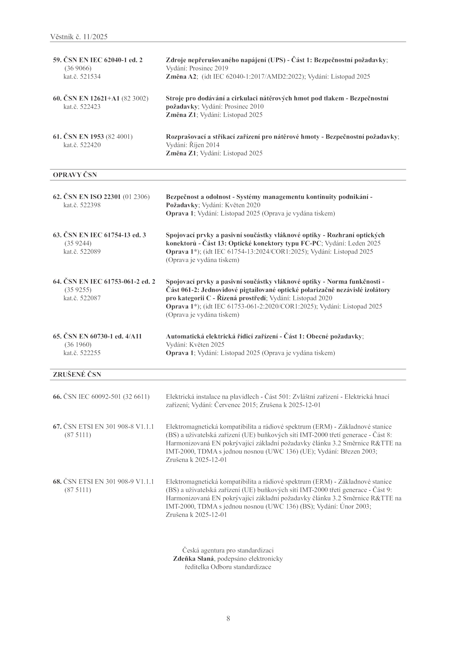 č. 2 (35 9255) kat.1 (87 5111) Elektromagnetická kompatibilita rádiové spektrum (ERM) Základnové stanice (BS) uživatelská zařízení (UE) buňkových sítí IMT-2000 třetí generace Část 9: Harmonizovaná pokrývající základní požadavky článku 3. 522420 Rozprašovací stříkací zařízení pro nátěrové hmoty Bezpečnostní požadavky; Vydání: Říjen 2014 Změna Z1; Vydání: Listopad 2025 OPRAVY ČSN 62. 522255 Automatická elektrická řídicí zařízení Část Obecné požadavky; Vydání: Květen 2025 Oprava Vydání: Listopad 2025 (Oprava vydána tiskem) ZRUŠENÉ ČSN 66.č.č. 522087 Spojovací prvky pasivní součástky vláknové optiky Norma funkčnosti - Část 061-2: Jednovidové pigtailované optické polarizačně nezávislé izolátory pro kategorii Řízená prostředí; Vydání: Listopad 2020 Oprava 1*); (idt IEC 61753-061-2:2020/COR1:2025); Vydání: Listopad 2025 (Oprava vydána tiskem) 65. 522423 Stroje pro dodávání cirkulaci nátěrových hmot pod tlakem Bezpečnostní požadavky; Vydání: Prosinec 2010 Změna Z1; Vydání: Listopad 2025 61.1. 3 (35 9244) kat. ČSN IEC 61753-061-2 ed. 521534 Zdroje nepřerušovaného napájení (UPS) Část Bezpečnostní požadavky; Vydání: Prosinec 2019 Změna A2; (idt IEC 62040-1:2017/AMD2:2022); Vydání: Listopad 2025 60.č. ČSN ETSI 301 908-8 V1. ČSN 12621+A1 (82 3002) kat. ČSN IEC 61754-13 ed.2 Směrnice R&TTE na IMT-2000, TDMA jednou nosnou (UWC 136) (UE); Vydání: Březen 2003; Zrušena 2025-12-01 68.č. 2 (36 9066) kat. ČSN ETSI 301 908-9 V1.č.č.2 Směrnice R&TTE na IMT-2000, TDMA jednou nosnou (UWC 136) (BS); Vydání: Únor 2003; Zrušena 2025-12-01 Česká agentura pro standardizaci Zdeňka Slaná, podepsáno elektronicky ředitelka Odboru standardizace . 522089 Spojovací prvky pasivní součástky vláknové optiky Rozhraní optických konektorů Část 13: Optické konektory typu FC-PC; Vydání: Leden 2025 Oprava 1*); (idt IEC 61754-13:2024/COR1:2025); Vydání: Listopad 2025 (Oprava vydána tiskem) 64. ČSN 60730-1 ed. 522398 Bezpečnost odolnost Systémy managementu kontinuity podnikání - Požadavky; Vydání: Květen 2020 Oprava Vydání: Listopad 2025 (Oprava vydána tiskem) 63. ČSN IEC 60092-501 (32 6611) Elektrická instalace plavidlech Část 501: Zvláštní zařízení Elektrická hnací zařízení; Vydání: Červenec 2015; Zrušena 2025-12-01 67.1. ČSN ISO 22301 (01 2306) kat.Věstník 11/2025 8 59. ČSN IEC 62040-1 ed. ČSN 1953 (82 4001) kat.1 (87 5111) Elektromagnetická kompatibilita rádiové spektrum (ERM) Základnové stanice (BS) uživatelská zařízení (UE) buňkových sítí IMT-2000 třetí generace Část 8: Harmonizovaná pokrývající základní požadavky článku 3. 4/A11 (36 1960) kat