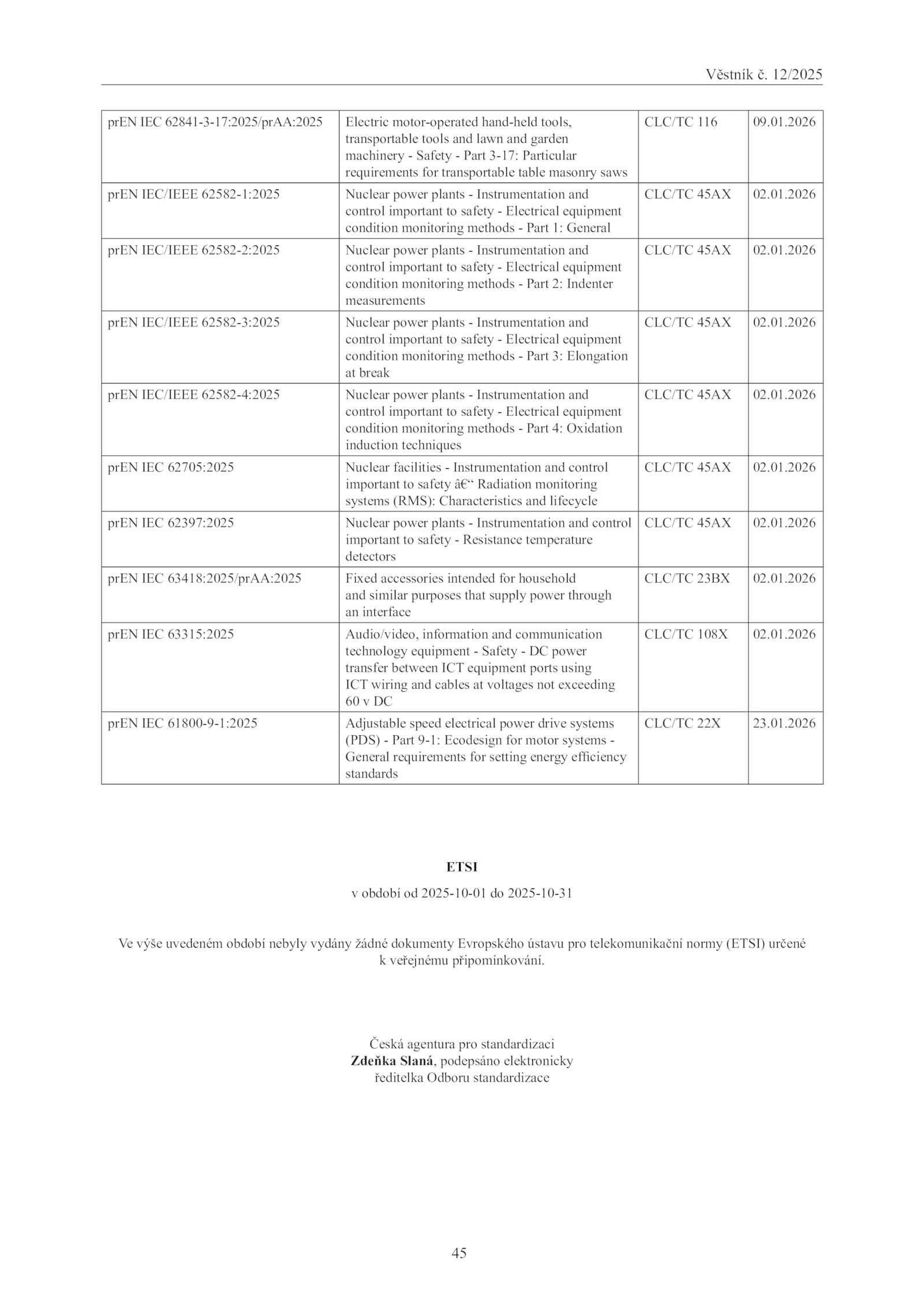 Ve výše uvedeném období nebyly vydány žádné dokumenty Evropského ústavu pro telekomunikační normy (ETSI) určené