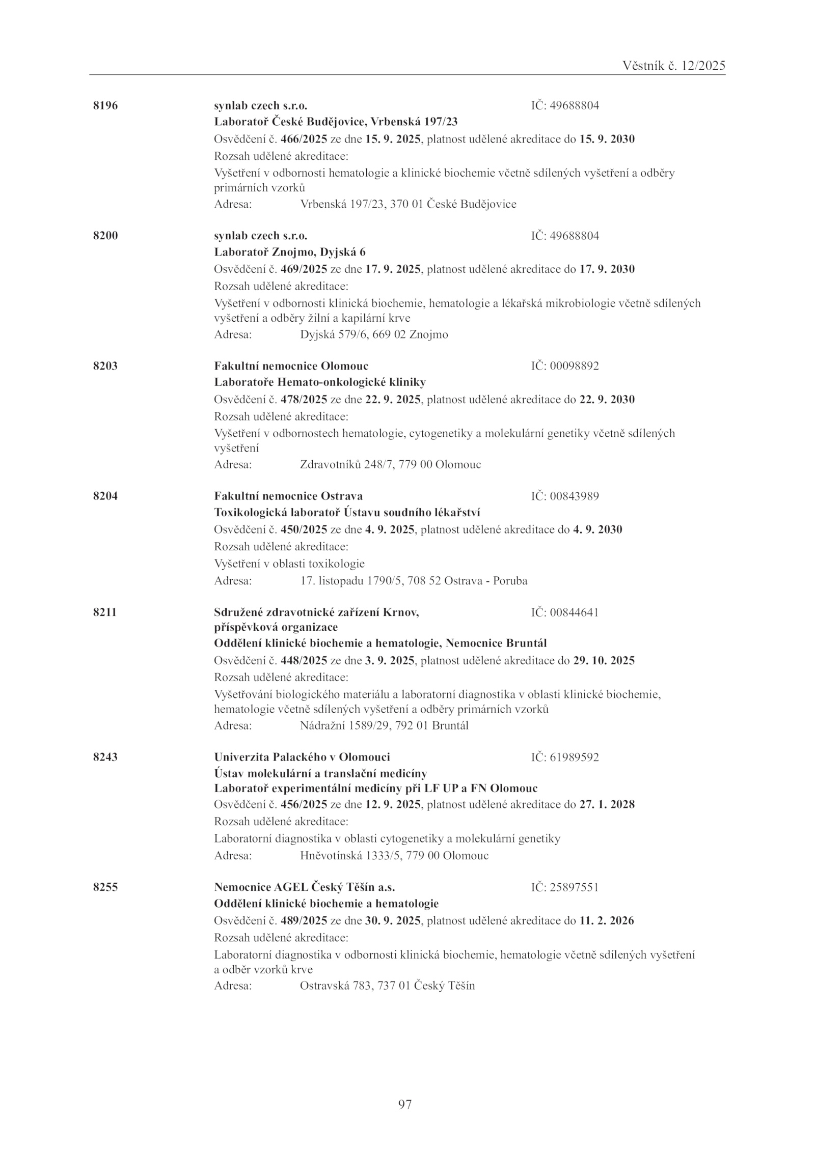 8200 synlab czech s. 2025, platnost udělené akreditace 15.Věstník 12/2025