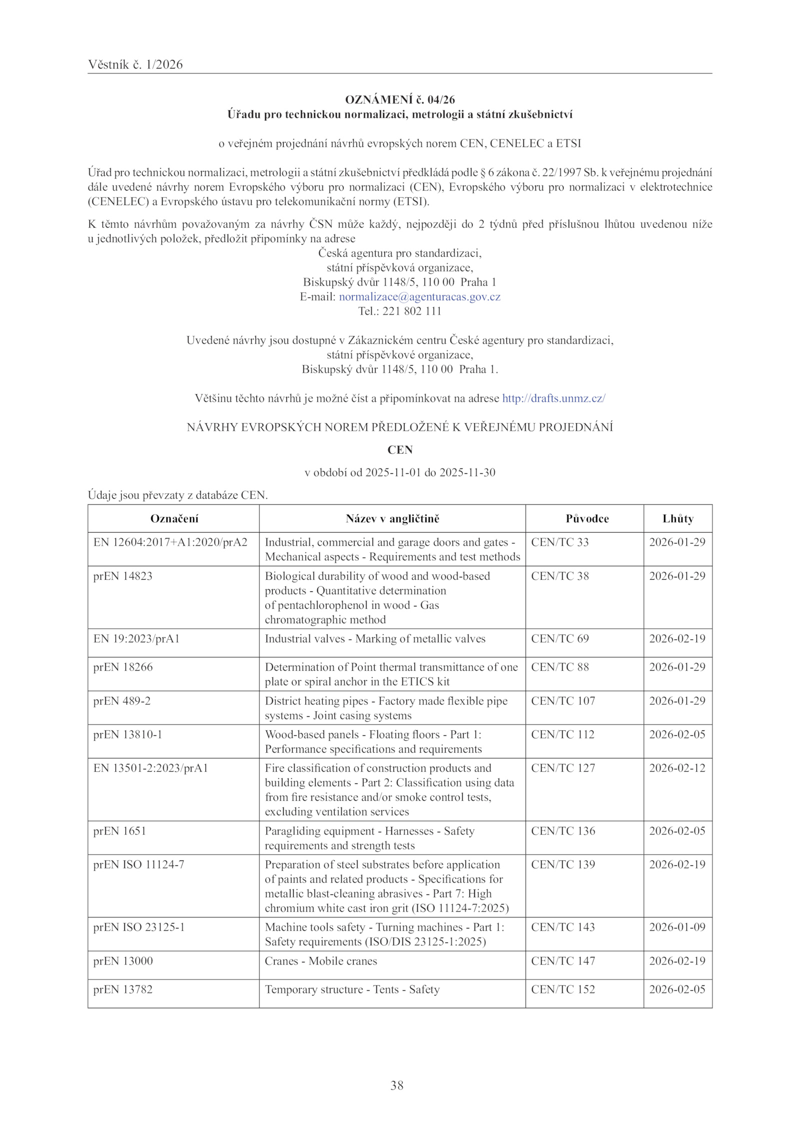 (CENELEC) Evropského ústavu pro telekomunikační normy (ETSI).Věstník 1/2026