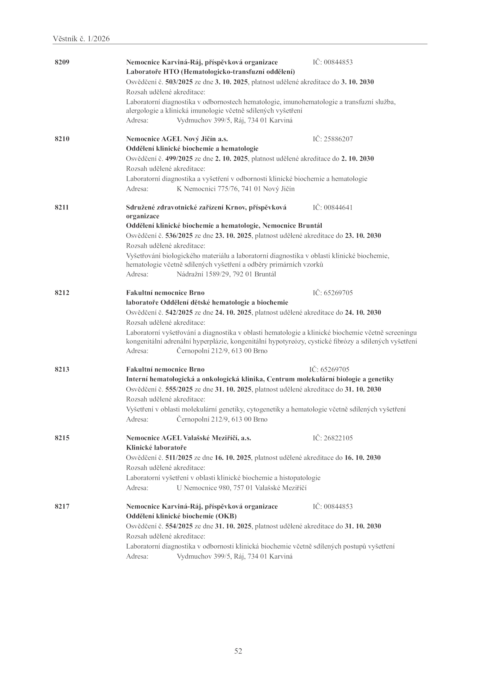Osvědčení 536/2025 dne 23. 2025, platnost udělené akreditace 24. 10. 2025, platnost udělené akreditace 16. 10. 10.Věstník 1/2026