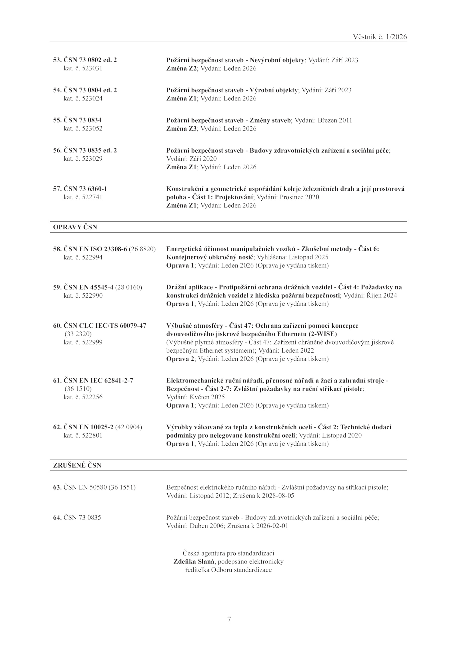 ČSN 10025-2 (42 0904) kat. ČSN CLC IEC/TS 60079-47 (33 2320) kat. ČSN 45545-4 (28 0160) kat. 522999 Výbušné atmosféry Část 47: Ochrana zařízení pomocí koncepce dvouvodičového jiskrově bezpečného Ethernetu (2-WISE) (Výbušné plynné atmosféry Část 47: Zařízení chráněné dvouvodičovým jiskrově bezpečným Ethernet systémem); Vydání: Leden 2022 Oprava Vydání: Leden 2026 (Oprava vydána tiskem) 61. ČSN 0802 ed. 523024 Požární bezpečnost staveb Výrobní objekty; Vydání: Září 2023 Změna Z1; Vydání: Leden 2026 55. 2 kat. 522994 Energetická účinnost manipulačních vozíků Zkušební metody Část 6: Kontejnerový obkročný nosič; Vyhlášena: Listopad 2025 Oprava Vydání: Leden 2026 (Oprava vydána tiskem) 59. 522256 Elektromechanické ruční nářadí, přenosné nářadí žací zahradní stroje - Bezpečnost Část 2-7: Zvláštní požadavky ruční stříkací pistole; Vydání: Květen 2025 Oprava Vydání: Leden 2026 (Oprava vydána tiskem) 62. ČSN ISO 23308-6 (26 8820) kat. 523029 Požární bezpečnost staveb Budovy zdravotnických zařízení sociální péče; Vydání: Září 2020 Změna Z1; Vydání: Leden 2026 57. ČSN 0835 ed.7 Věstník 1/2026 53. ČSN IEC 62841-2-7 (36 1510) kat. 522801 Výrobky válcované tepla konstrukčních ocelí Část Technické dodací podmínky pro nelegované konstrukční oceli; Vydání: Listopad 2020 Oprava Vydání: Leden 2026 (Oprava vydána tiskem) ZRUŠENÉ ČSN 63. 523031 Požární bezpečnost staveb Nevýrobní objekty; Vydání: Září 2023 Změna Z2; Vydání: Leden 2026 54. 523052 Požární bezpečnost staveb Změny staveb; Vydání: Březen 2011 Změna Z3; Vydání: Leden 2026 56. ČSN 50580 (36 1551) Bezpečnost elektrického ručního nářadí Zvláštní požadavky stříkací pistole; Vydání: Listopad 2012; Zrušena 2028-08-05 64. 2 kat. ČSN 0835 Požární bezpečnost staveb Budovy zdravotnických zařízení sociální péče; Vydání: Duben 2006; Zrušena 2026-02-01 Česká agentura pro standardizaci Zdeňka Slaná, podepsáno elektronicky ředitelka Odboru standardizace . ČSN 0834 kat. 522741 Konstrukční geometrické uspořádání koleje železničních drah její prostorová poloha Část Projektování; Vydání: Prosinec 2020 Změna Z1; Vydání: Leden 2026 OPRAVY ČSN 58. ČSN 0804 ed. 2 kat. ČSN 6360-1 kat. 522990 Drážní aplikace Protipožární ochrana drážních vozidel Část Požadavky na konstrukci drážních vozidel hlediska požární bezpečnosti; Vydání: Říjen 2024 Oprava Vydání: Leden 2026 (Oprava vydána tiskem) 60