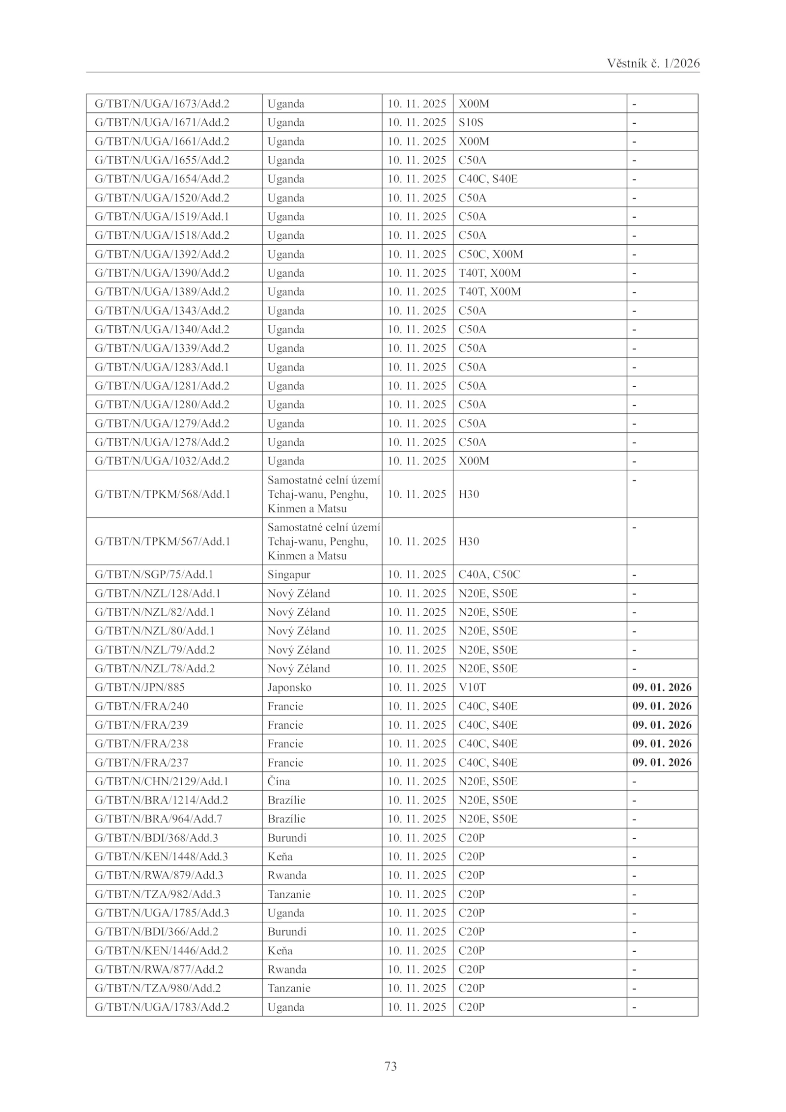 G/TBT/N/UGA/1278/Add. 11. 01.2 Uganda 10.1 Nový Zéland 10.3 Uganda 10. 11.Věstník 1/2026
