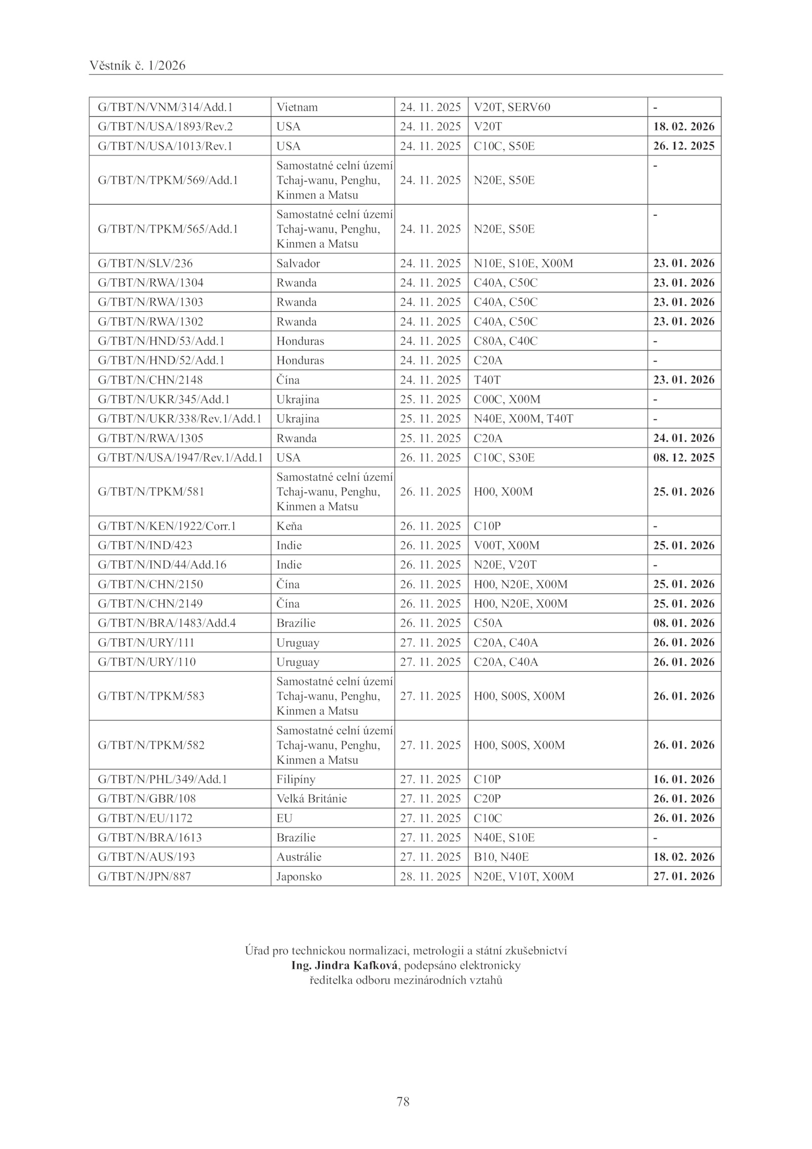 G/TBT/N/GBR/108 Velká Británie 27. 2025 N20E, V10T, X00M 27. 11. 2025 C40A, C50C 23. 11.1 Honduras 24. 2026