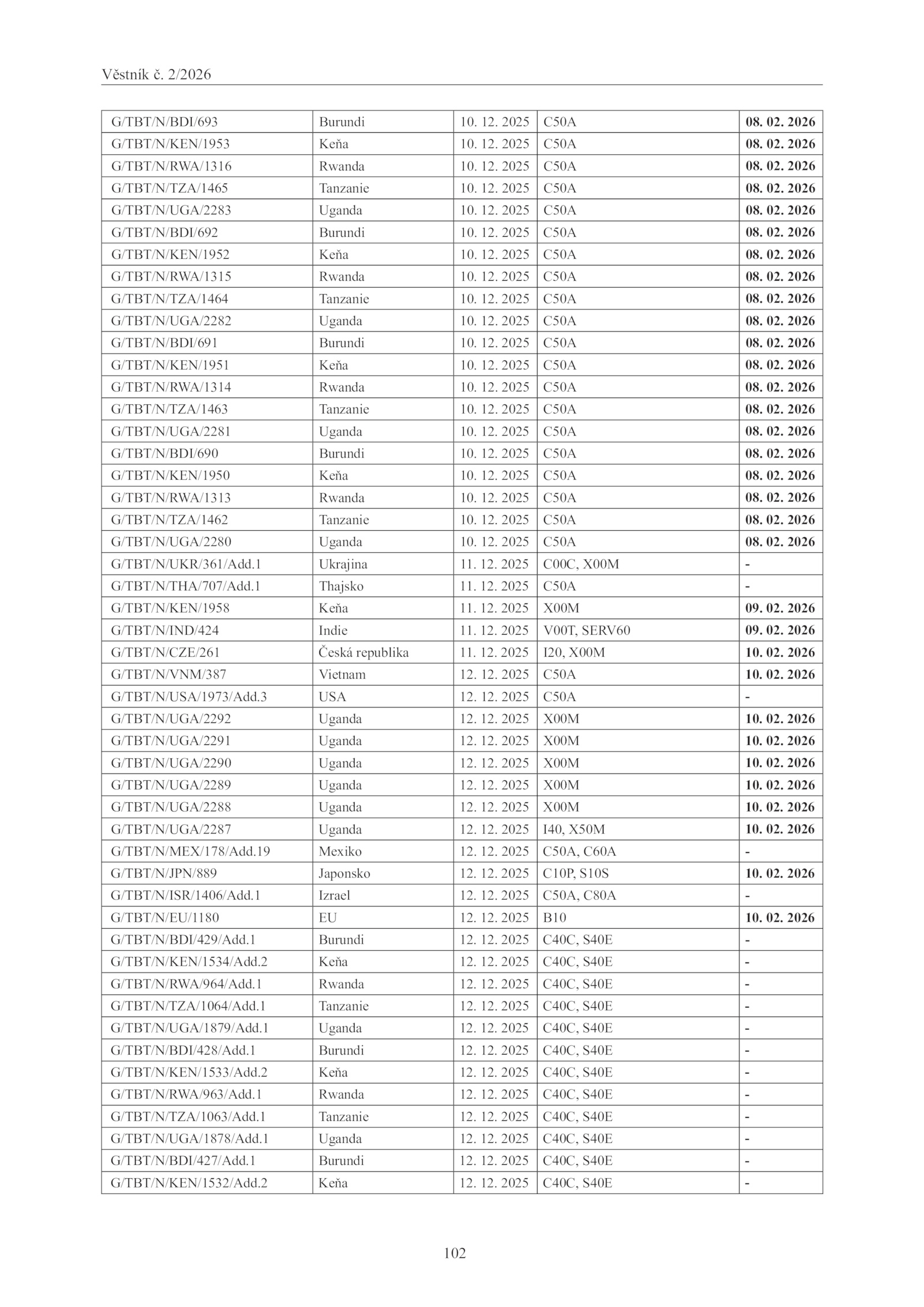 G/TBT/N/KEN/1953 Keňa 10. 2025 C10P, S10S 10. 02. 12. 12. 2025 C50A 08. 02. 12. 2026