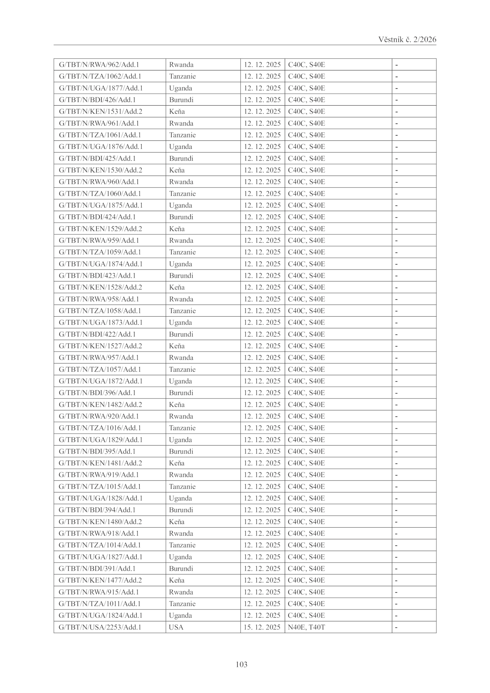 G/TBT/N/UGA/1827/Add.2 Keňa 12.1 Tanzanie 12. 12. 12. 2025 C40C, S40E -