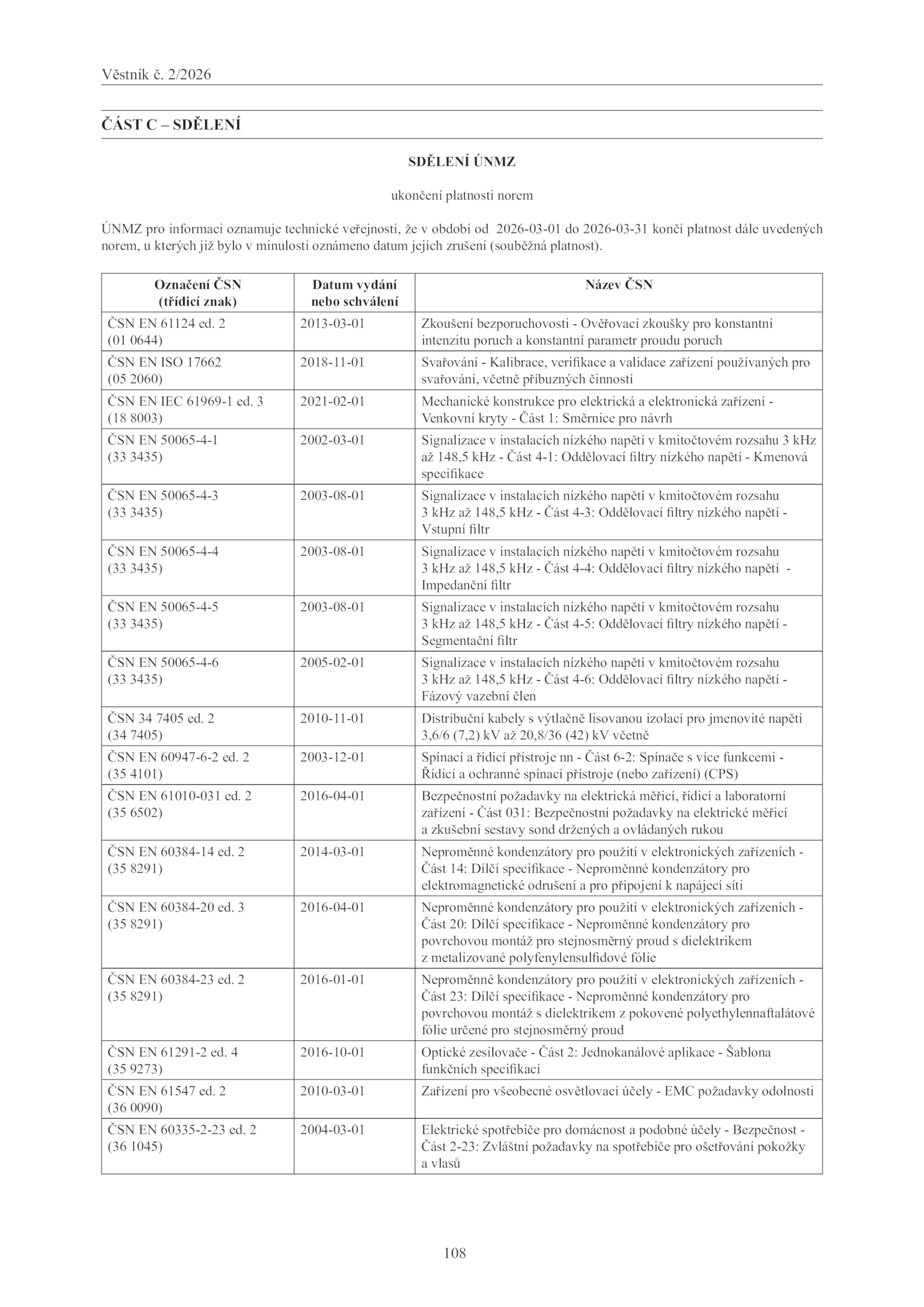ÚNMZ pro informaci oznamuje technické veřejnosti, období 2026-03-01 2026-03-31 končí platnost dále uvedených