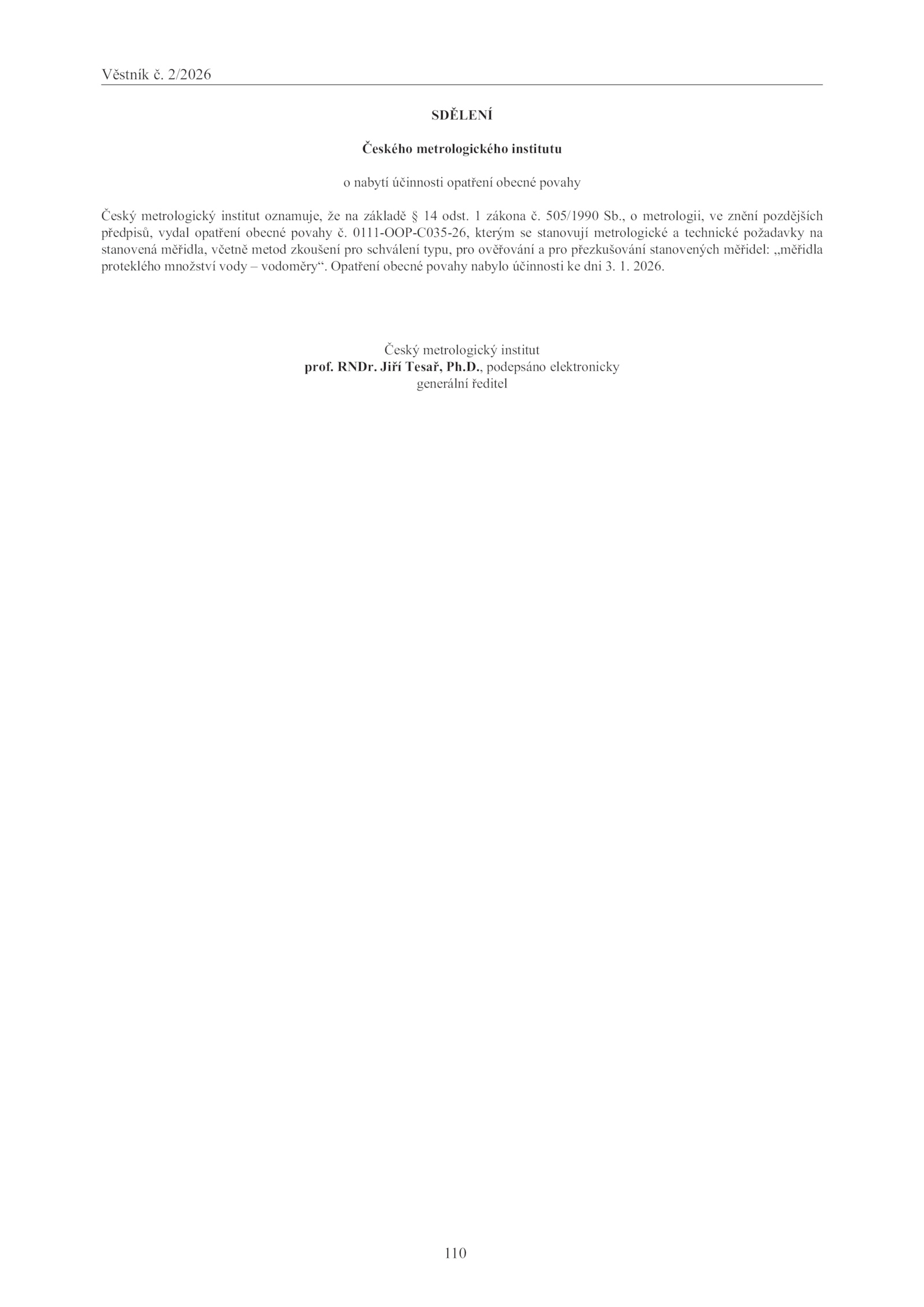 předpisů, vydal opatření obecné povahy 0111-OOP-C035-26, kterým stanovují metrologické technické požadavky na